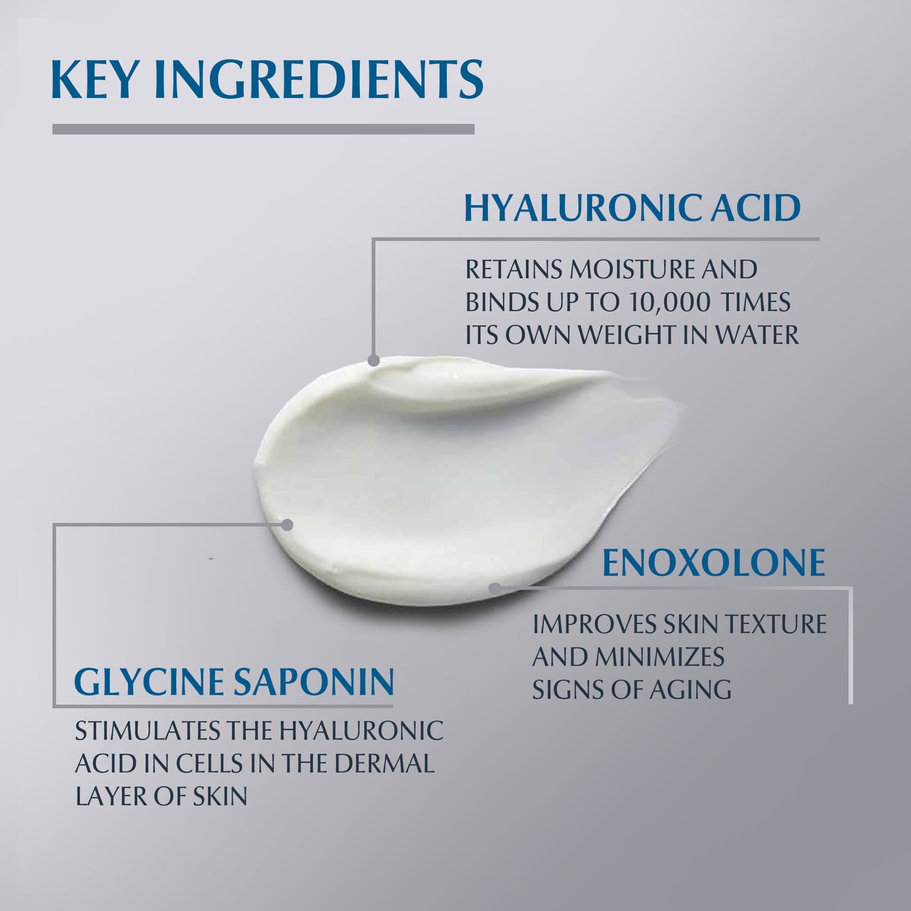 - Also contains bio-active Glycine-saponin to further stimulate skin’s own natural production of Hyaluronic acid, improving moisture retention levels