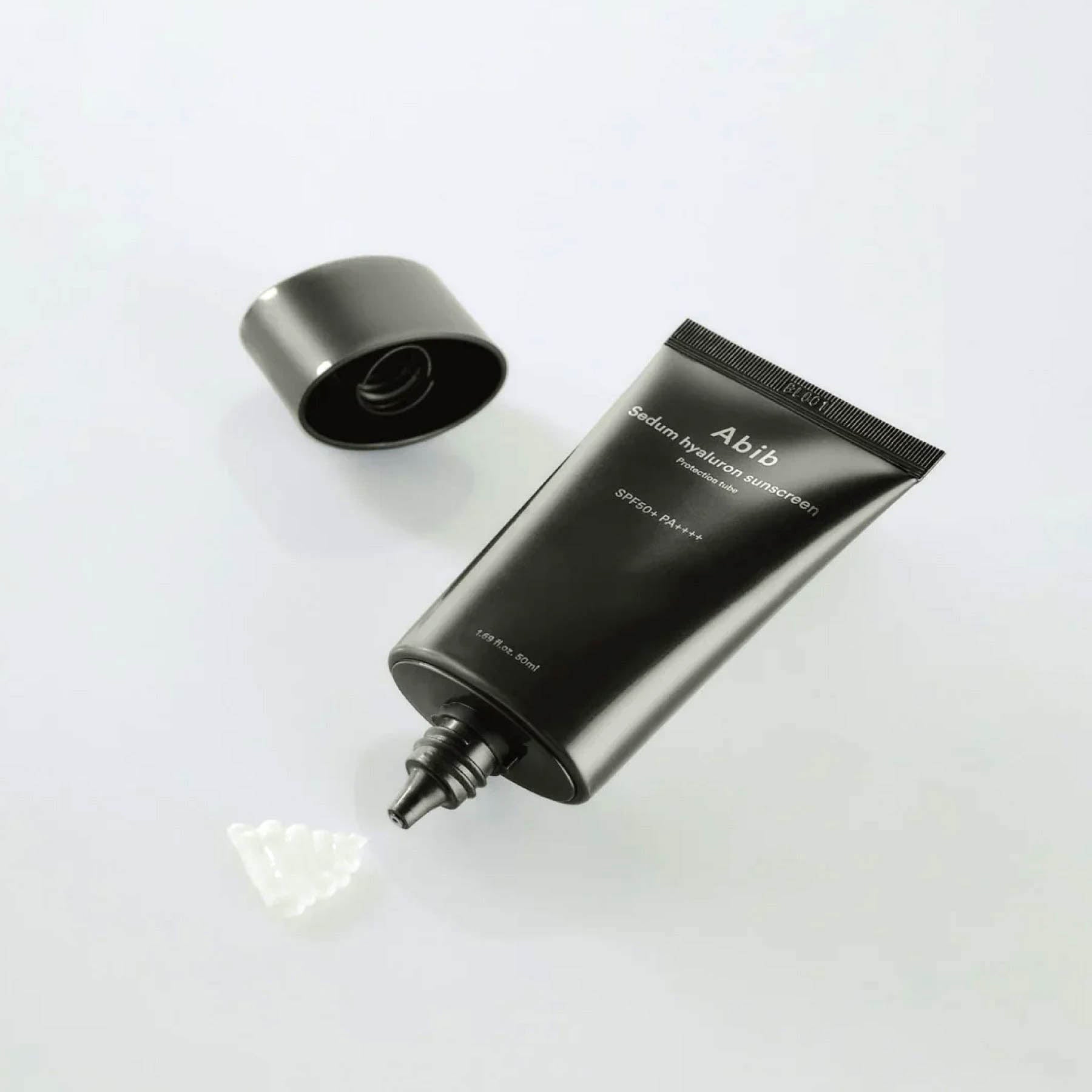 - Abib Sedum Hyaluron Sunscreen Protection Tube 50ml, a lightweight moisturising sunscreen formulated with Sedum Sarmentosum flowers from Jeju Island and 10 hyaluronic acids to provide intense hydration that fills up deep inside the skin while soothe irritation caused by UV rays. It has a washable sunscreen formula that can be easily removed with a facial cleanser, making it suitable for sensitive skin.