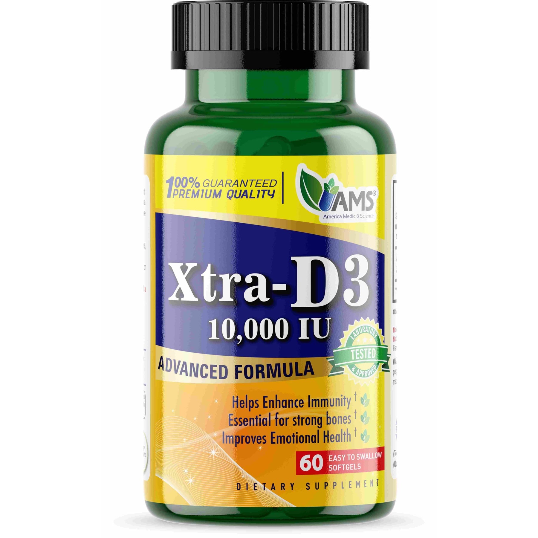 - AMS Xtra-D3 10,000 IU 60 Softgels supports bone strength, immunity, and calcium absorption naturally
