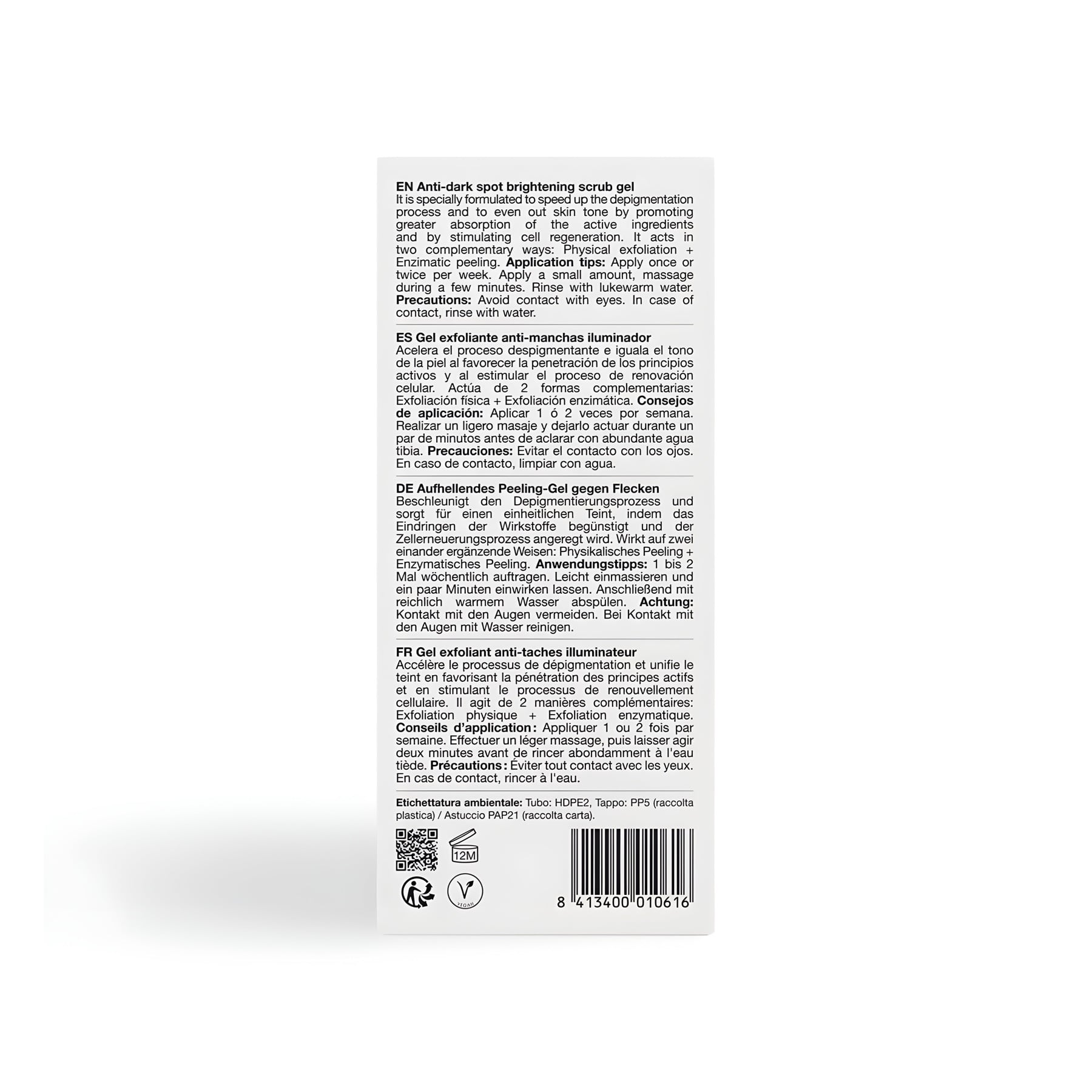 Biodegradable jojoba pearls. Biodegradable spheres that depigment and unify skin tone, with antioxidant and anti-inflammatory properties, Enzyme of biotechnological origin. Enzymatic exfoliation that removes dead cells to soften the skin surface and promote cell renewal,Polylactic acid. Biodegradable, gentle particles that scrub the skin.