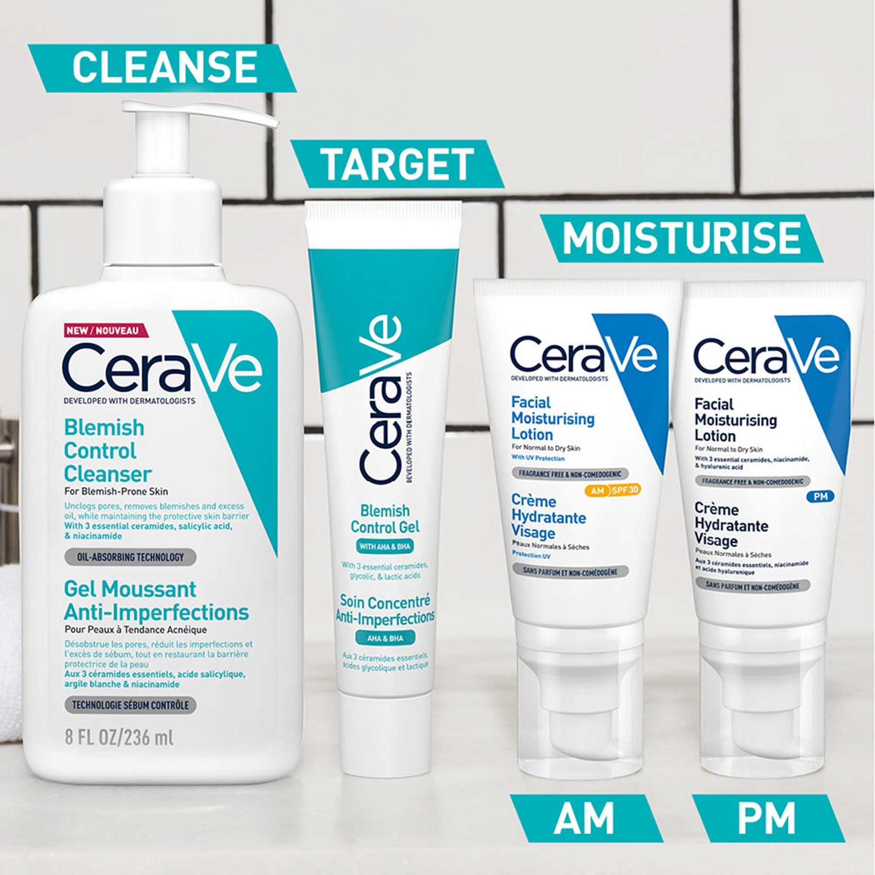 - CeraVe Blemish Control Gel Facial Moisturiser acne treatment for face with BHA/AHA exfoliant formulated with salicylic acid, beta-hydroxy acid (BHA), to help clear acne & prevent new breakouts and alpha hydroxy acids (AHA), a blend of lactic and glycolic acids, to help smooth and soften skin. The formula helps to minimize the appearance of pores & reduce blackheads. Also formulated with niacinamide to help soothe skin and hyaluronic acid to help maintain skins natural moisture. CeraVe Blemish Control Gel is alcohol free, fragrance free, paraben free, oil free, and non-comedogenic skin care. Formulated without drying alcohols like denatured alcohol, commonly found in acne spot treatments, which can cause excessive dryness. CeraVe Blemish Control Gel contains 3 essential ceramides that are found naturally in the skin and makeup 50% of the lipids in the skin barrier. All CeraVe products, are formulated with three essential ceramides (1, 3, 6-ii)to help maintain the skin’s natural barrier. CeraVe skincare is developed with dermatologists and has products suitable for dry skin, sensitive skin, oily skin, acne-prone, and more.