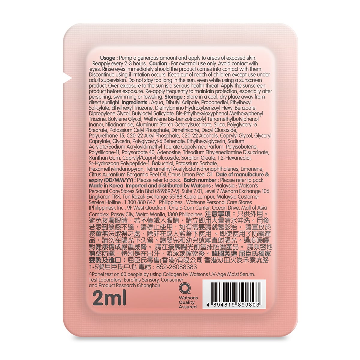 - Collagen by Watsons Moist Sun Serum combines biodesigned vegan collagen with SPF protection to restore and protect skin from external elements