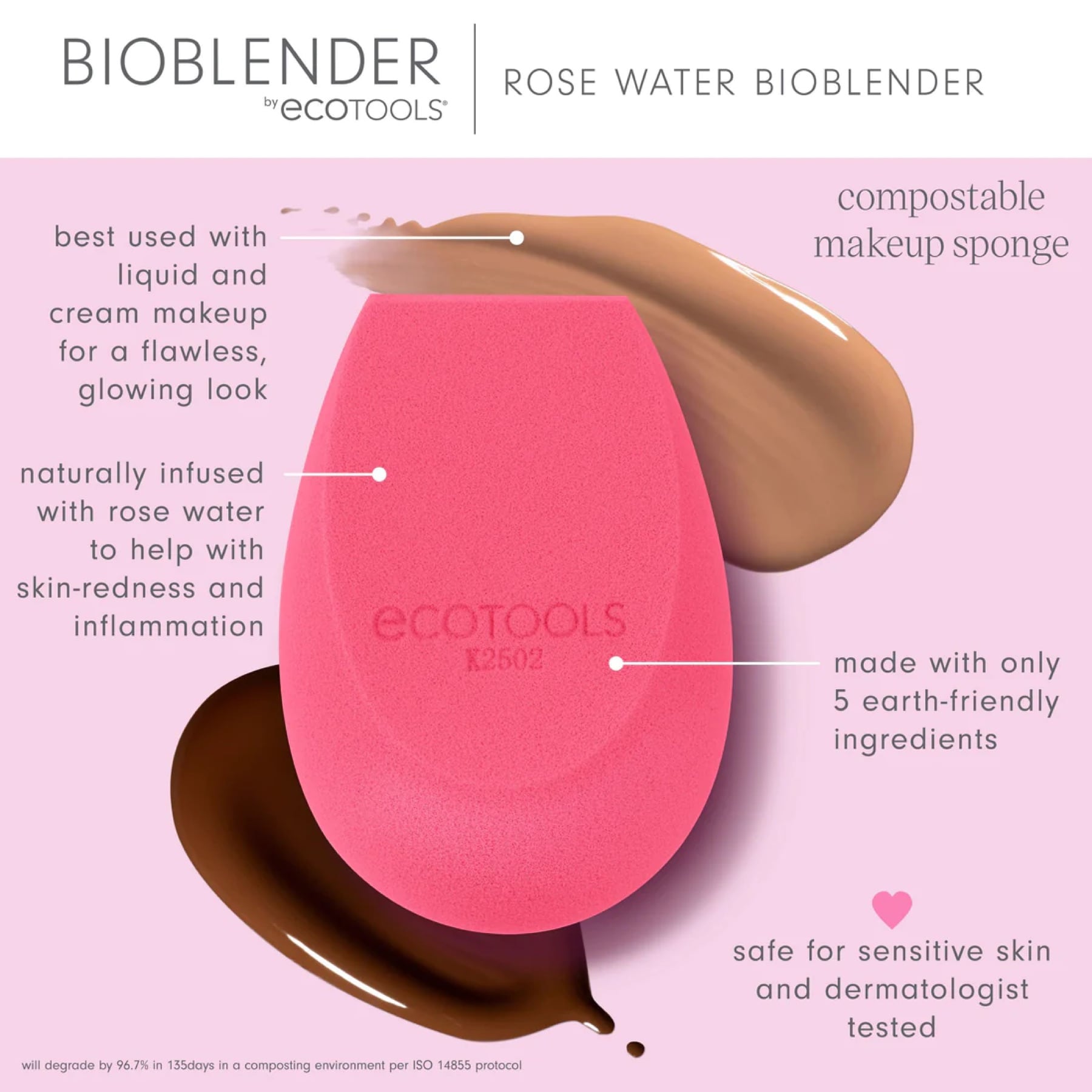 - EcoTools Rose Water Bioblender is a sustainable makeup sponge that creates a smooth, flawless finish with a touch of rose water.