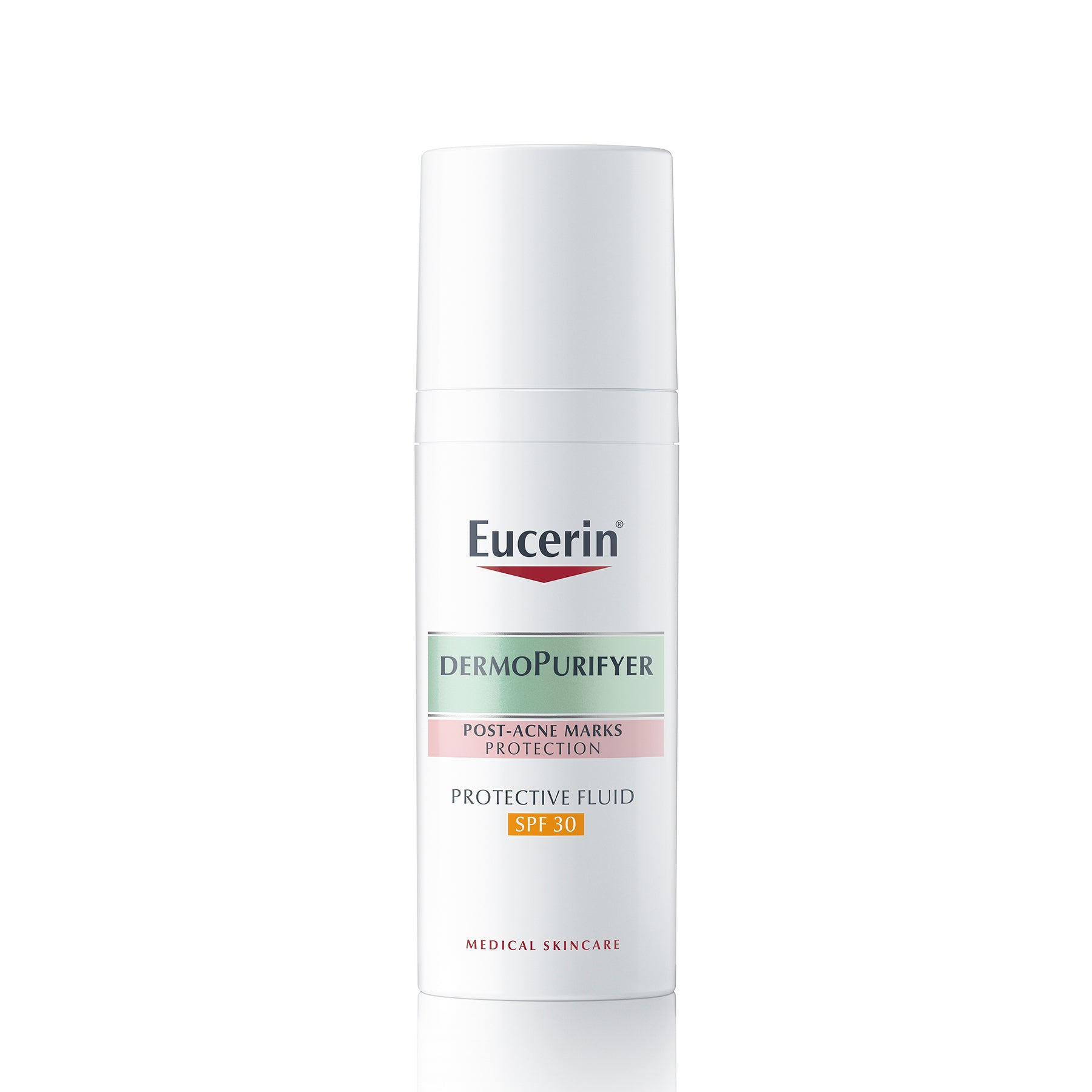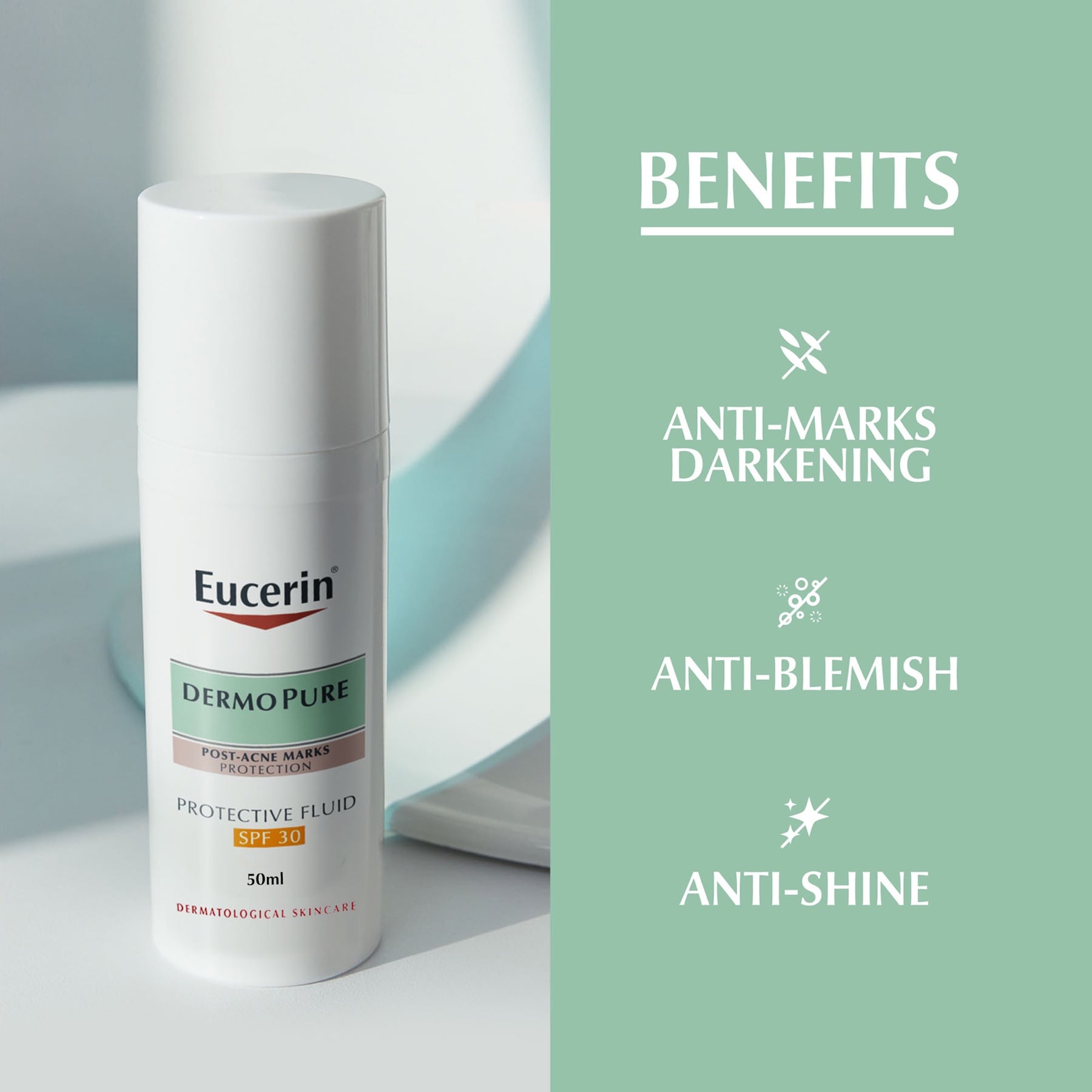 - Eucerin DermoPure Protective Fluid SPF 30 help prevent blemishes and finally beat post-acne marks with 3 key factors: anti-marks darkening, anti-blemish and anti-shine. Its SPF30 UVA/B filters your skin from sun-induced darkening of post-acne marks and prevents their re-appearance while its Decanedoil and Licochalcone A ingredients help prevent blemishes and soothes irritations, respectively. This fluid is also made with Sebum Regulating Technology that delivers a long-lasting, dry, matt finish. Use this product with DermoPure Triple Effect Serum to enhance its effects.