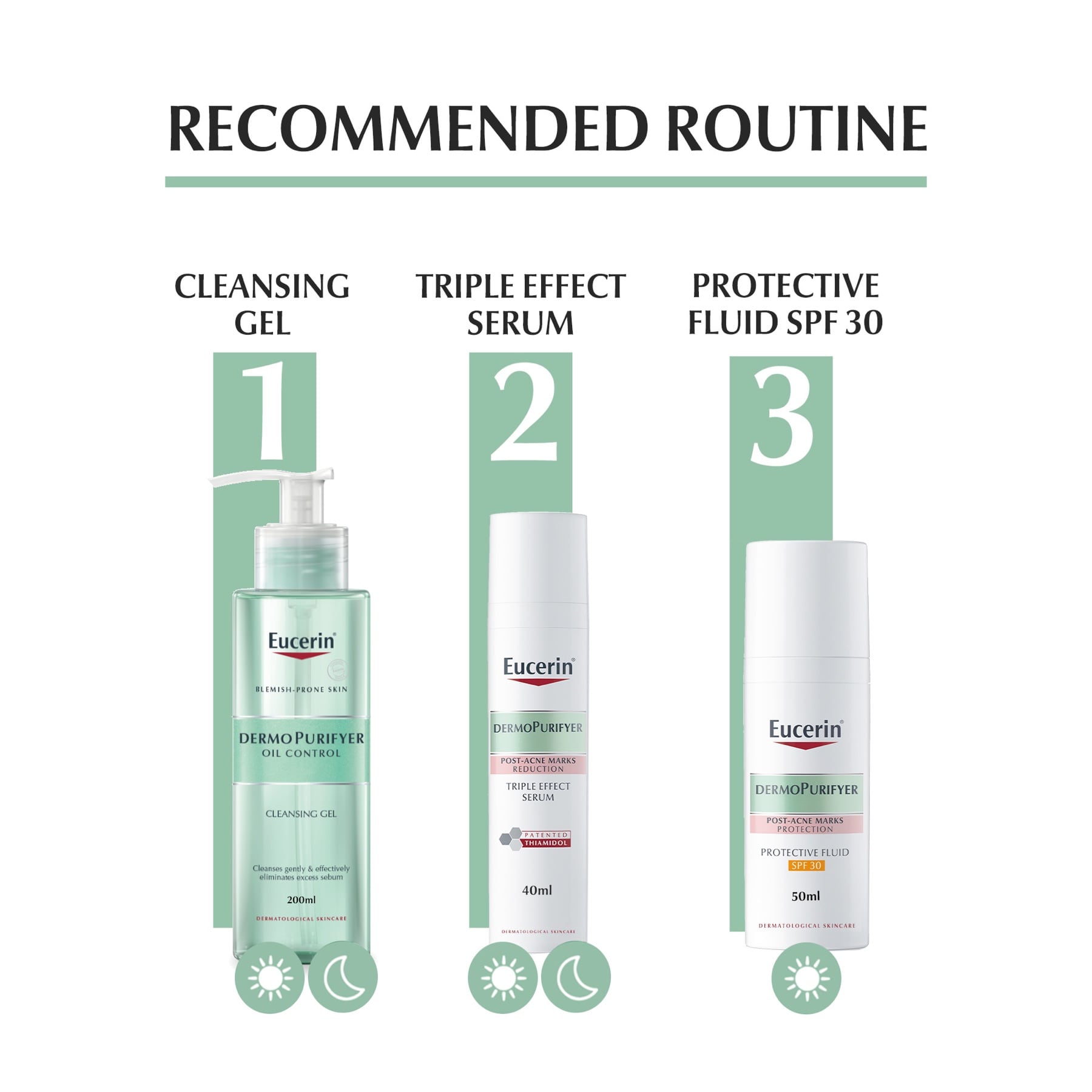 - Eucerin DermoPure Triple Effect Serum is infused with patented Thiamidol that will help you to finally beat blemishes and post-acne marks. This serum helps with its 3 key factors. It helps to prevent marks with the help of patented Thiamidol that acts at the root cause of hyperpigmentation, reduces persistent post-acne marks and prevents their appearance. It also helps minimise blemishes with Salicylic Acid which effectively reduces blemishes and Licochalcone A helps to prevent new blemishes from appearing. With Sebum Regulating Technology, the serum also delivers a long-lasting dry, matt finish. Enjoy the best results possible by using this serum with the Eucerin DermoPure Protective Fluid SPF 30.