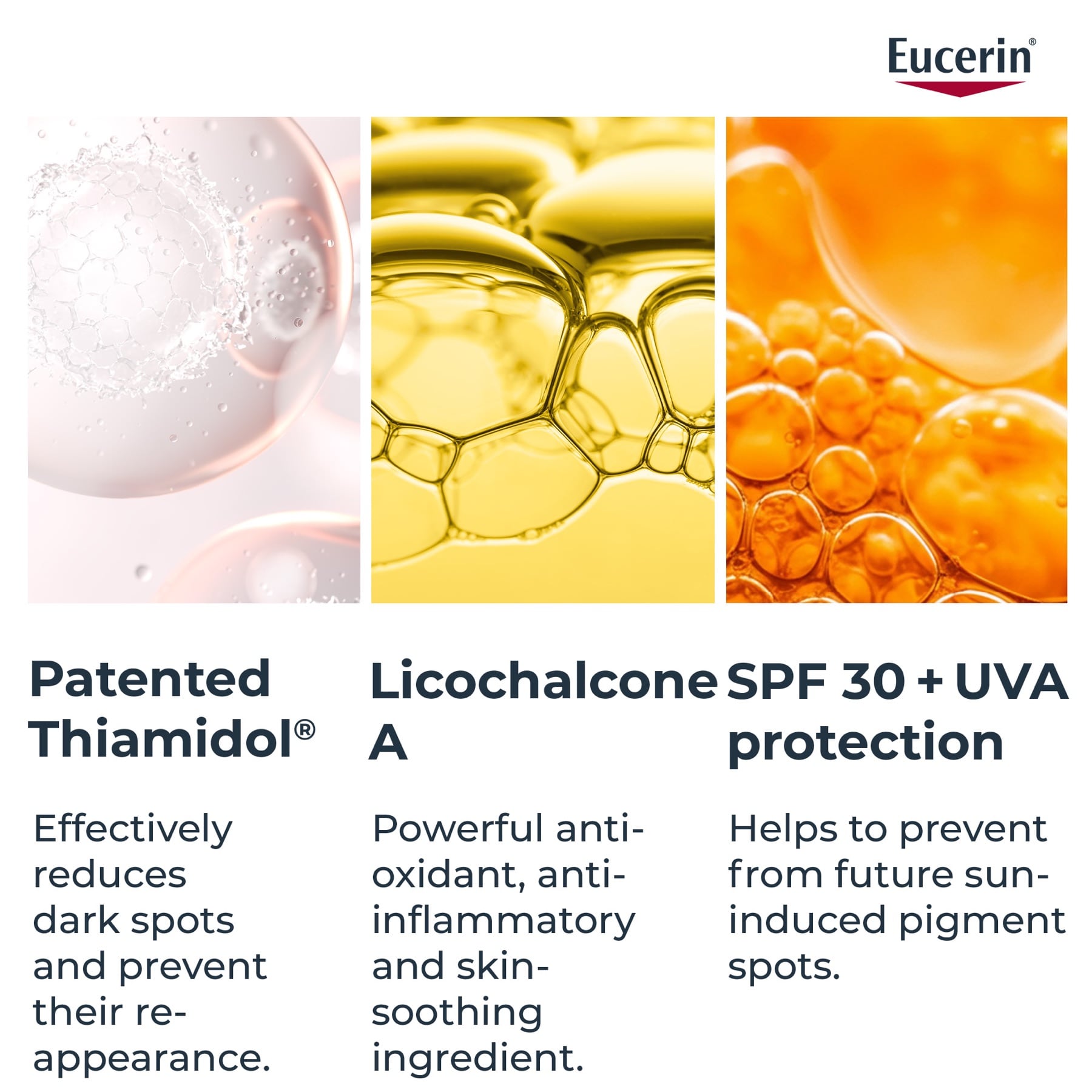 - EUCERIN Even Pigment Perfector Day SPF30 contains Thiamidol, an effective and patented ingredient that acts at the root cause of hyperpigmentation by reducing melanin production