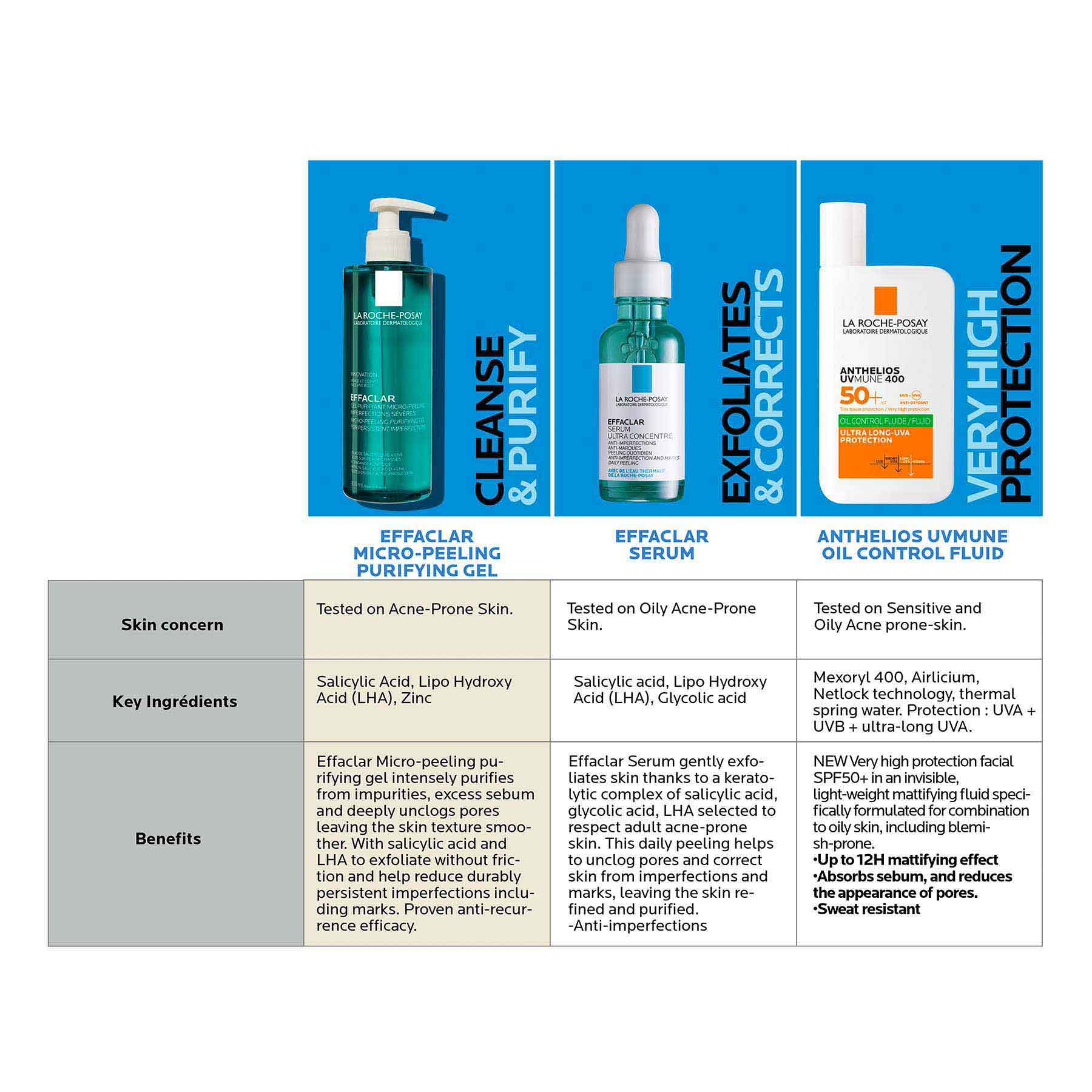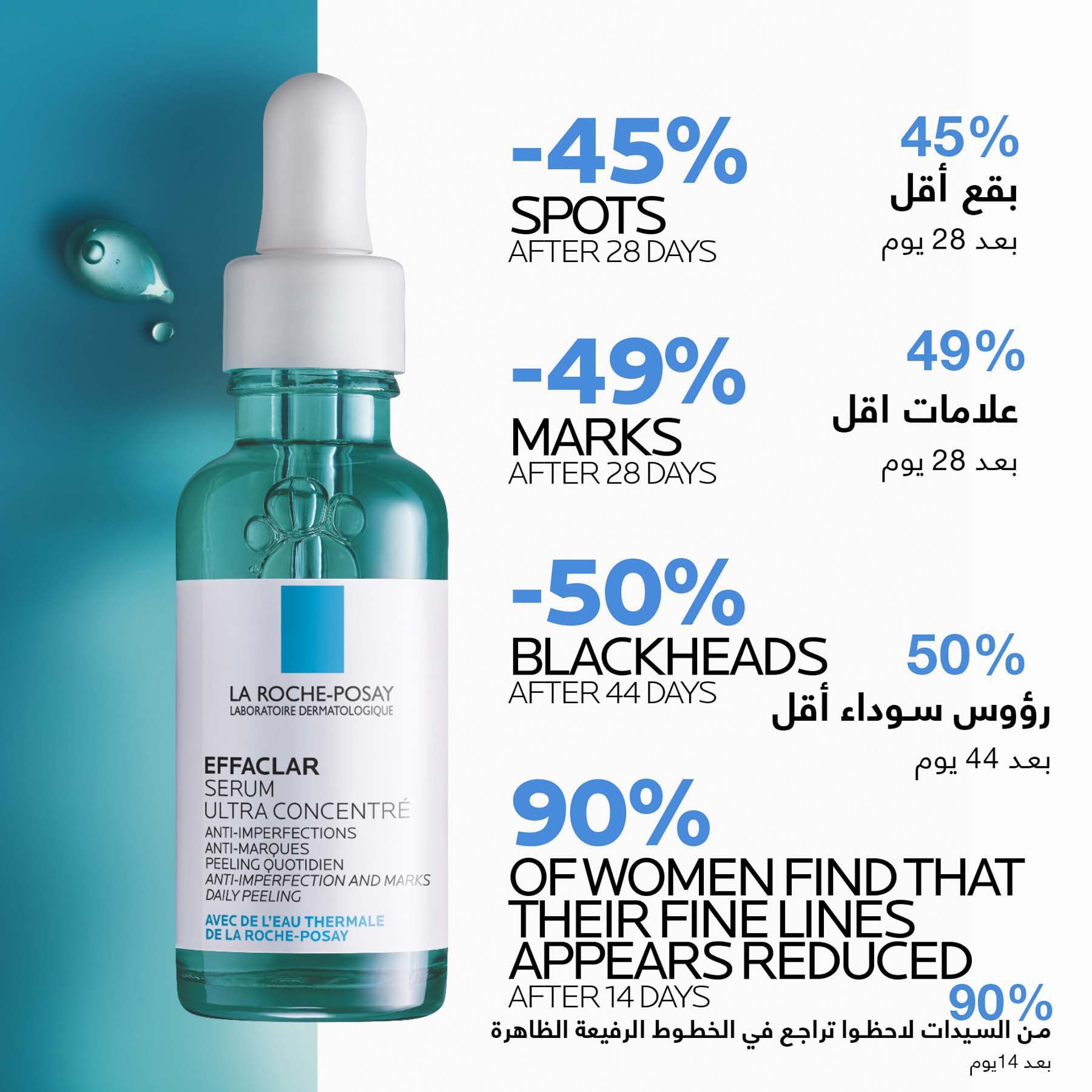 - La Roche Posay Effaclar serum is a concentrate of exfoliating acids combined with soothing niacinamide, that targets blackheads, pimples, marks, and visible pores. This no-rinse formula leaves the skin refined and purified. The first ultra sensorial La Roche Posay care to combine such a high concentration of synergic actives: 3 keratolytic acids to reduce imperfections and marks + niacinamide & Thermal spring water for a soothing, anti-redness effect and anti-recurrence proven efficacy. Specifically adapted and well-tolerated for acne-prone skin. Non-comedogenic. Tested on acne-prone skin. Avoid eye area. In contact with eyes, rinse thoroughly. Use in association with a daily photo-protection product (SPF > 15). Do not apply on open scars.