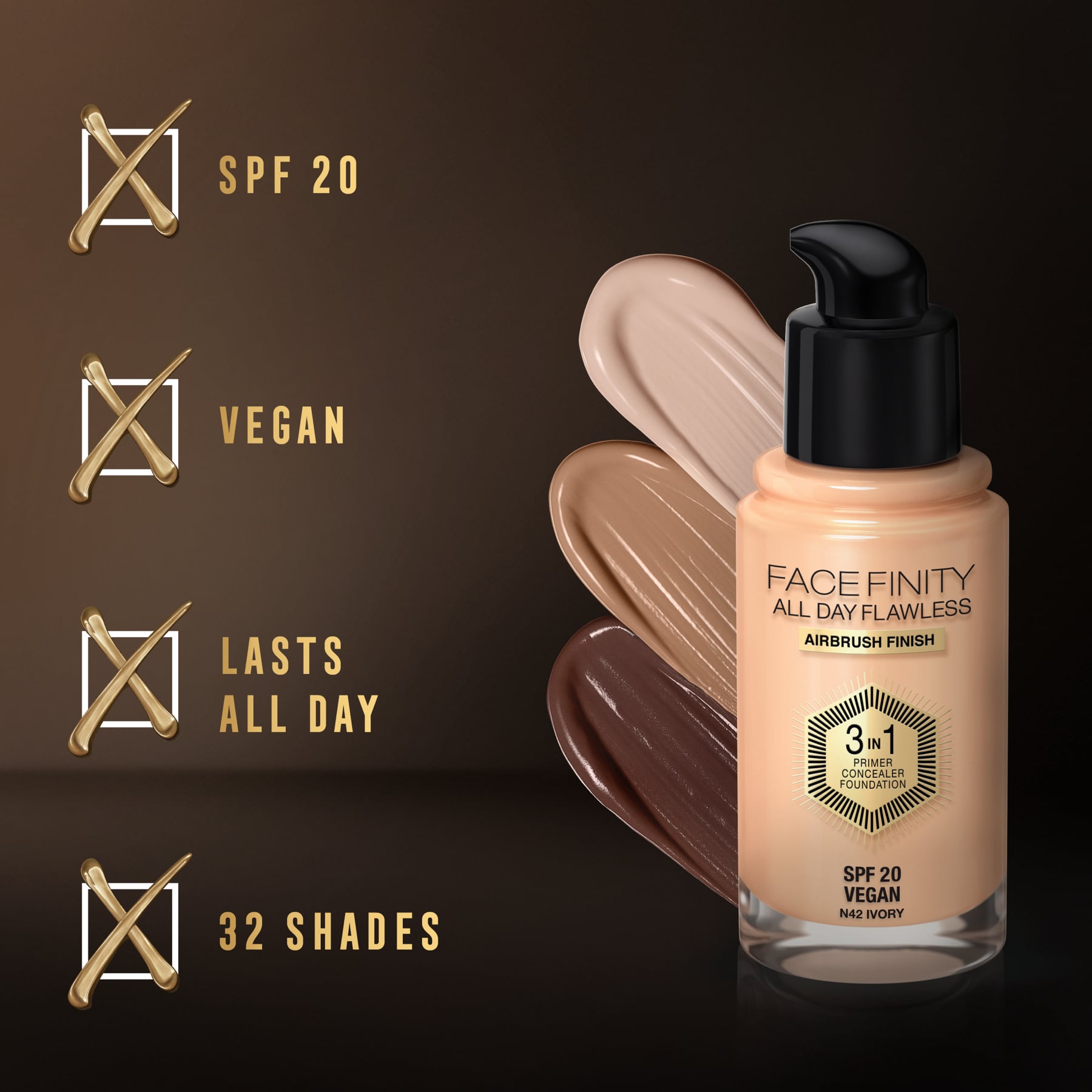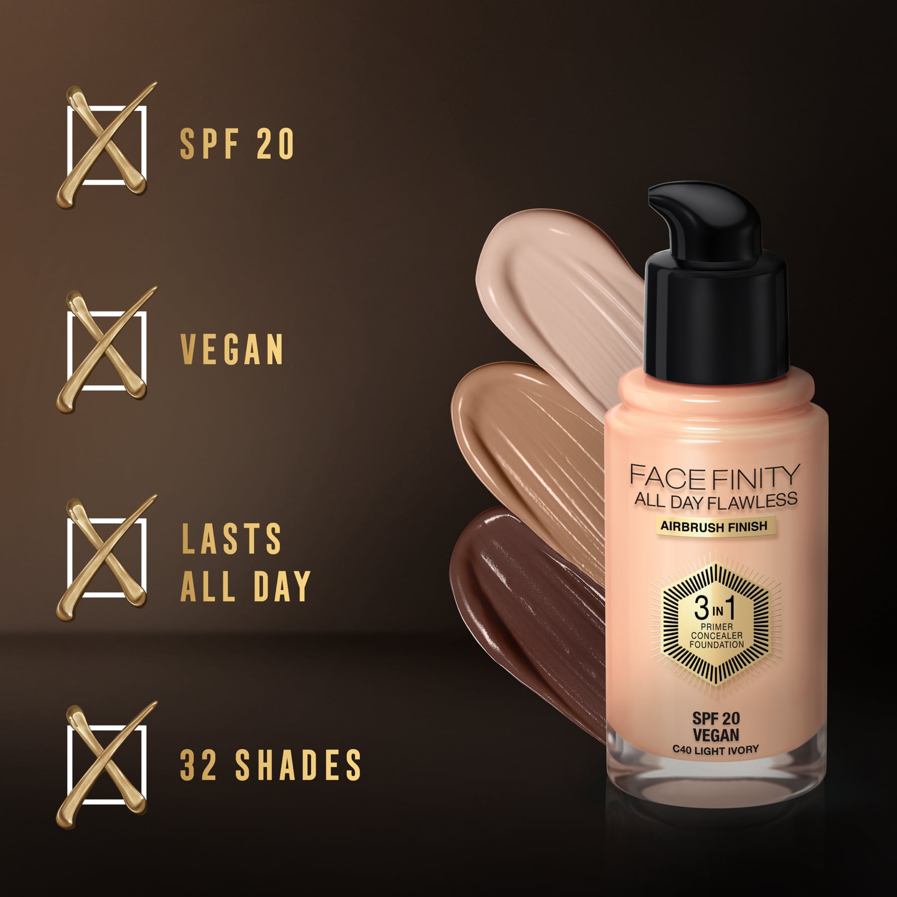 - Max Factor Facefinity All Day Flawless 3 In 1 Foundation Matte Finish 30ml has got your skin covered -- literally! It comes in a unique 3-in-one formula that can be used as a foundation, primer and concealer. The creamy formula blends well and hides skin imperfections, dark circles and uneven skin tone, and gives you a radiantly matte finish. Flexi-hold technology moves with your skin and delivers a lightweight coverage that stays on all-day despite sweat and water.