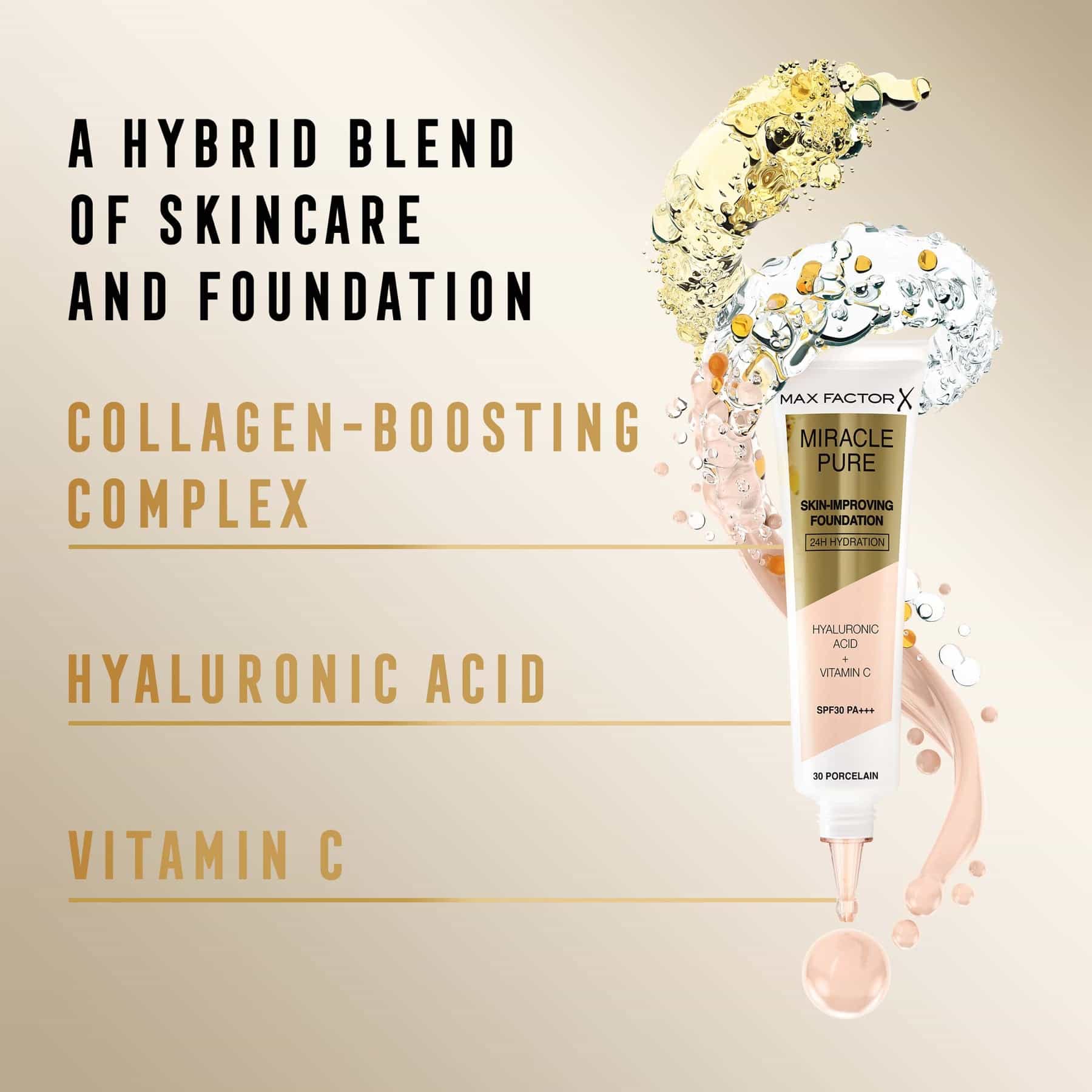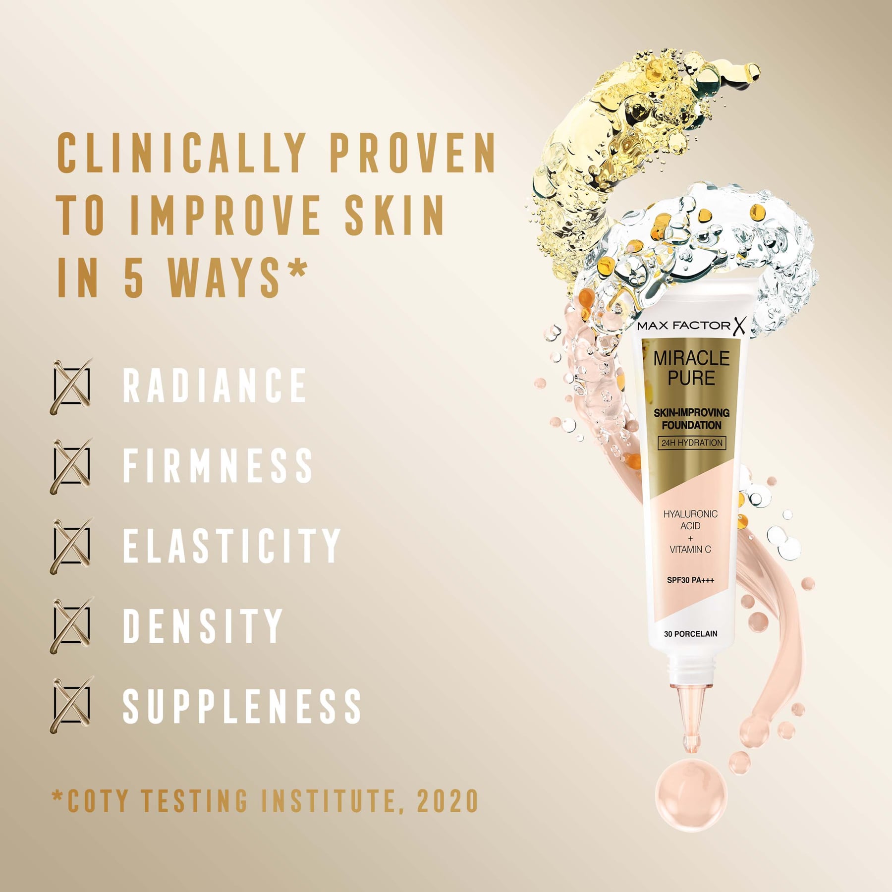 - Max Factor Miracle Pure Skin-Improving Foundation 30ml is clinically proven to care for skin while you wear it. In just one minute and with just a drop, it pumps your skin, lets your complexion benefit in five ways, with improved radiance, firmness, elasticity, density, and suppleness. The advanced formula is infused with 89% skincare ingredients including collagen-boosting complex, Vitamin C and hyaluronic acid. Clinically proven to provide you with 24 hours of hydration, it will instantly plump and improve skin’s firmness and elasticity day by day. Available in a dermatologically tested medium-coverage, buildable shade with SPF30PA+++ UVA/UVB protection.