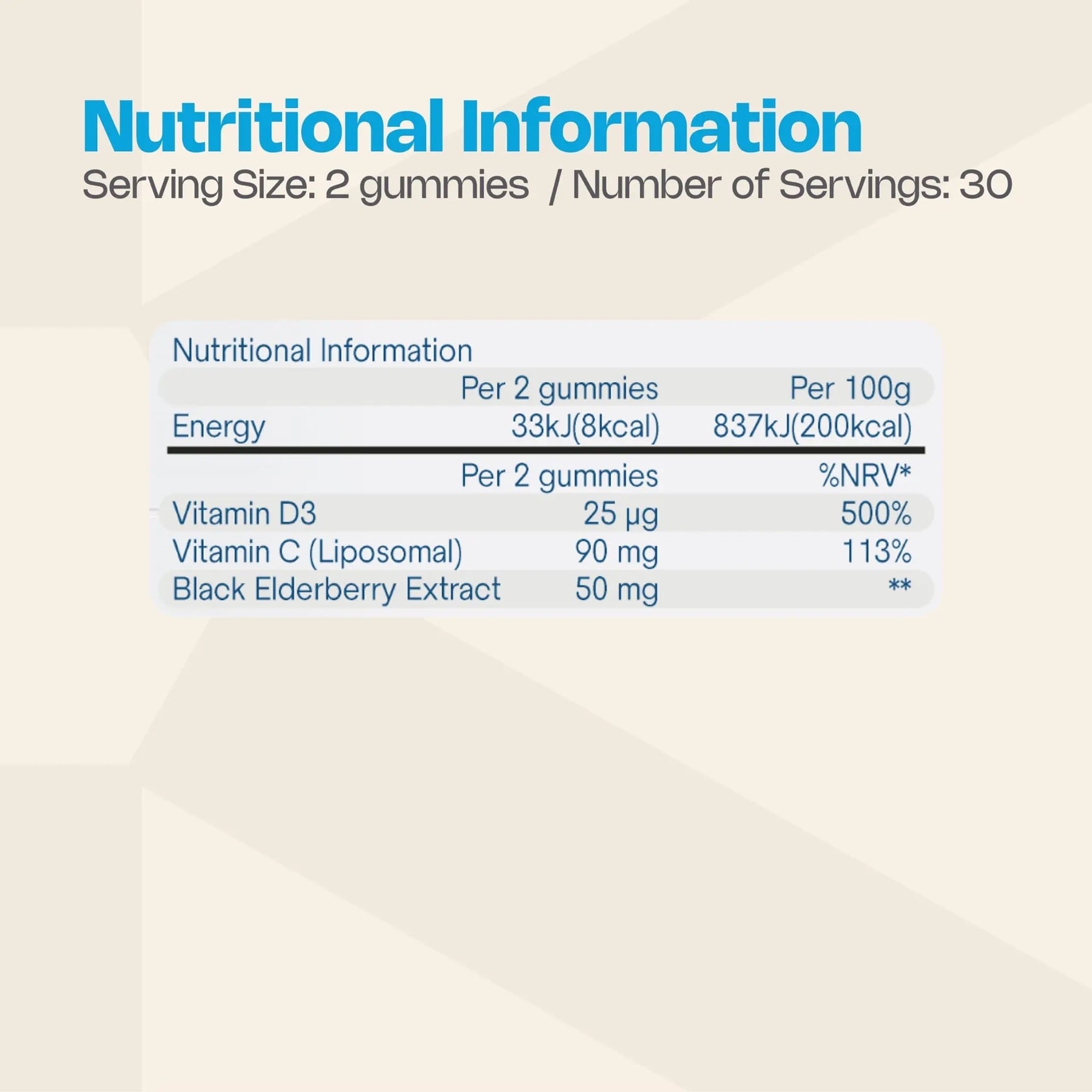 Sweeteners (Maltitol, lsomalt), Water,Gelling Agent (Pectin), Liposomal Vitamin C (Vegetable Oil, Cocoa Butter, Isomaltose Syrup, Buffer Salt, Ascorbic Acid), Acidity Regulators (Citric Acid, Sodium Citrate), Black Elderberry Extract, Natural Flavours, Colouring Foods (Blueberry Extract, Cherry Extract), Vegetable Oil (Coconut Oil, Glazing Agent [Carnauba Wax]), Sweetener (Steviol Glycosides from Stevia), Vitamin D3 (Cholecalciferol)