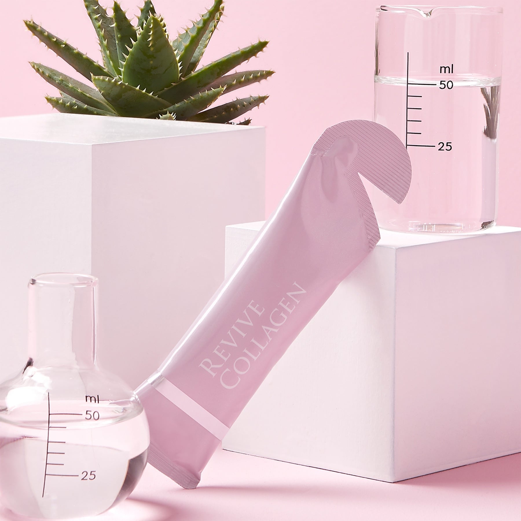 - Revive Collagen Original contains 8,500mg of collagen as well as hyaluronic acid which plumps the skin and in doing so, reduces the appearance of fine lines and wrinkles, as well as improving skin hydration and texture. It also contains aloe vera which works as an anti-inflammatory helping to hydrate and soothe skin.