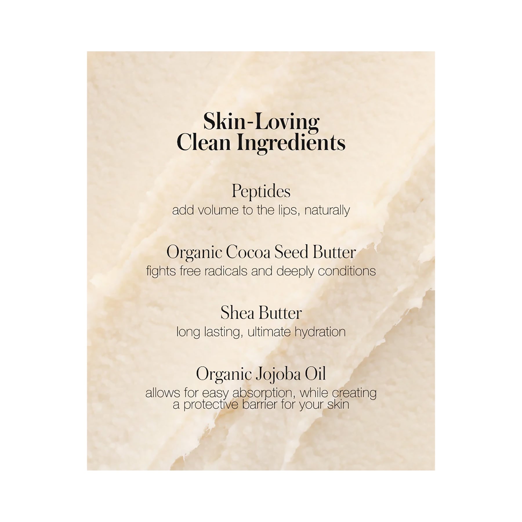Babette: Hydroxystearic/Linolenic/Oleic Polyglycerides, Theobroma Cacao (Cocoa) Seed Butter, Helianthus Annuus (Sunflower) Seed Oil, Butyrospermum Parkii (Shea) Butter, Euterpe Oleracea Sterols, Copernicia Cerifera (Carnauba) Wax/Cera Carnauba/Cire de carnauba, Polyhydroxystearic Acid, Dimer Dilinoleyl Dimer Dilinoleate, *Simmondsia Chinensis (Jojoba) Seed Oil, Coco-Caprylate/Caprate, Punica Granatum Flower Extract, Polyglyceryl-3 Diisostearate, Tocopherol (non-GMO), Vanillin, Cetearyl Ethylhexanoate, Mica, Ricinus Communis (Castor) Seed Oil, Sorbitan Isostearate, Portulaca Pilosa Extract, Sucrose Cocoate, Palmitoyl Tripeptide-38, Tin Oxide, Titanium Dioxide (CI 77891), Iron Oxides (CI 77491), Red 6 (CI 15850), May Contain (+/-): Iron Oxides (CI 77492, CI 77499), Red 7 Lake (CI 15850), Red 27 (CI 45410). * Certified Organic/Certifié Biologique