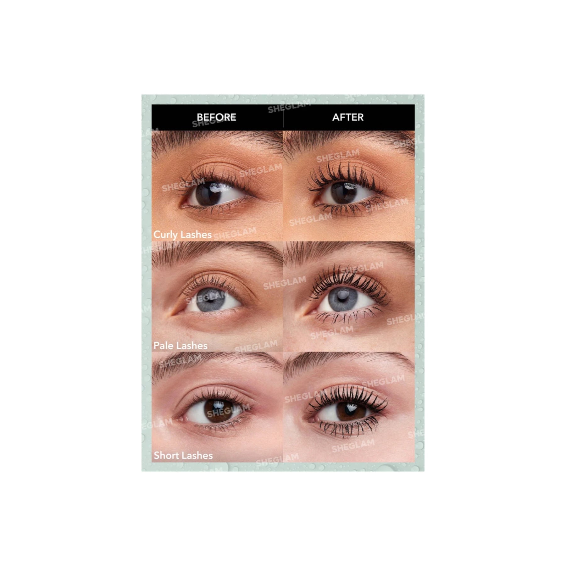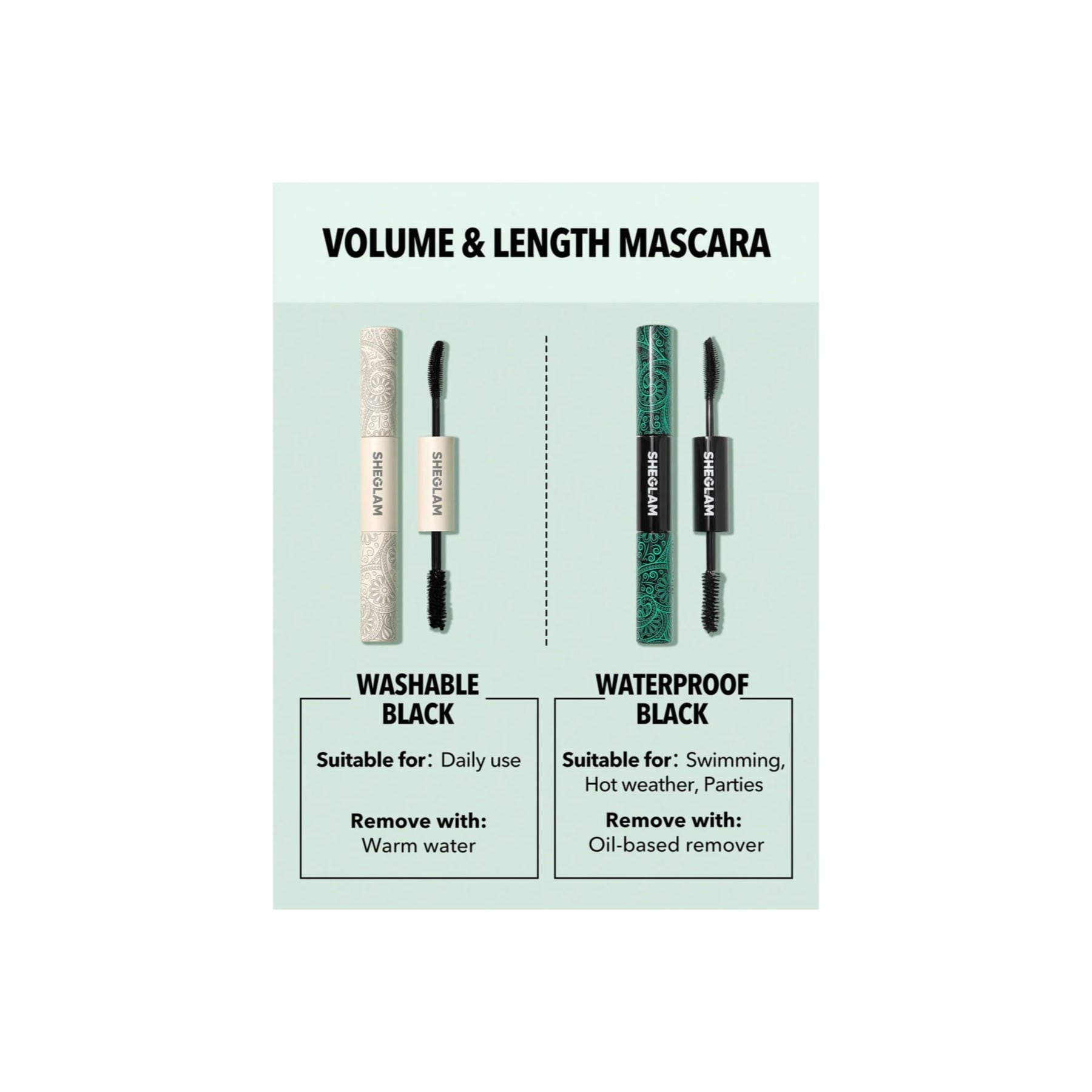 - Sheglam All-in-One Volume & Length Mascara features a dual-ended brush with two different quick-drying, smudgeproof, yet washable formulas. Apply together or separately for a totally custom, clump-free look that delivers intense volume, length, curl, and separation!