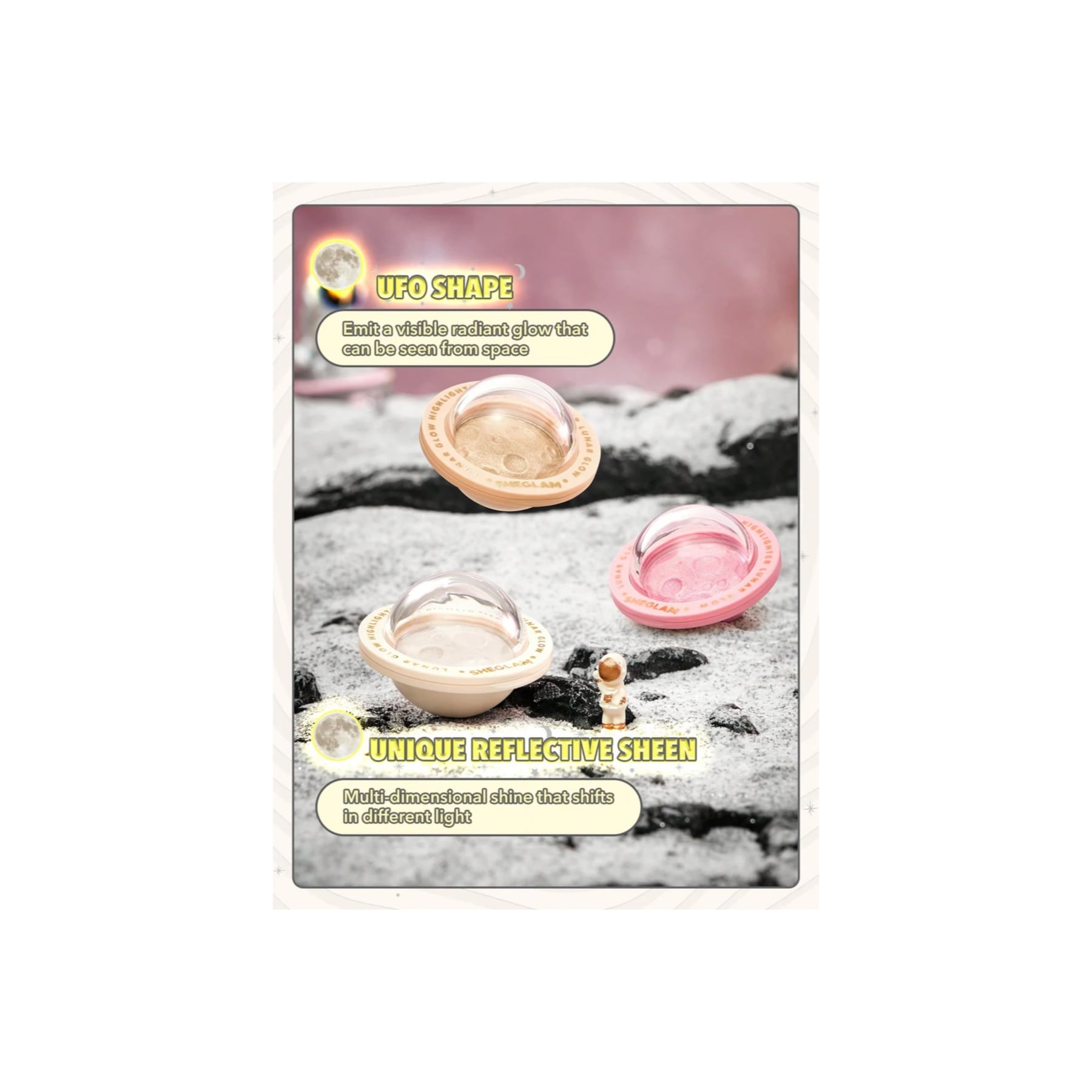 - Achieve a glow that you can see all the way from outerspace with this highlighter! Featuring a unique reflective sheen, you'll have all the extraterrestrials jelly of your shine.