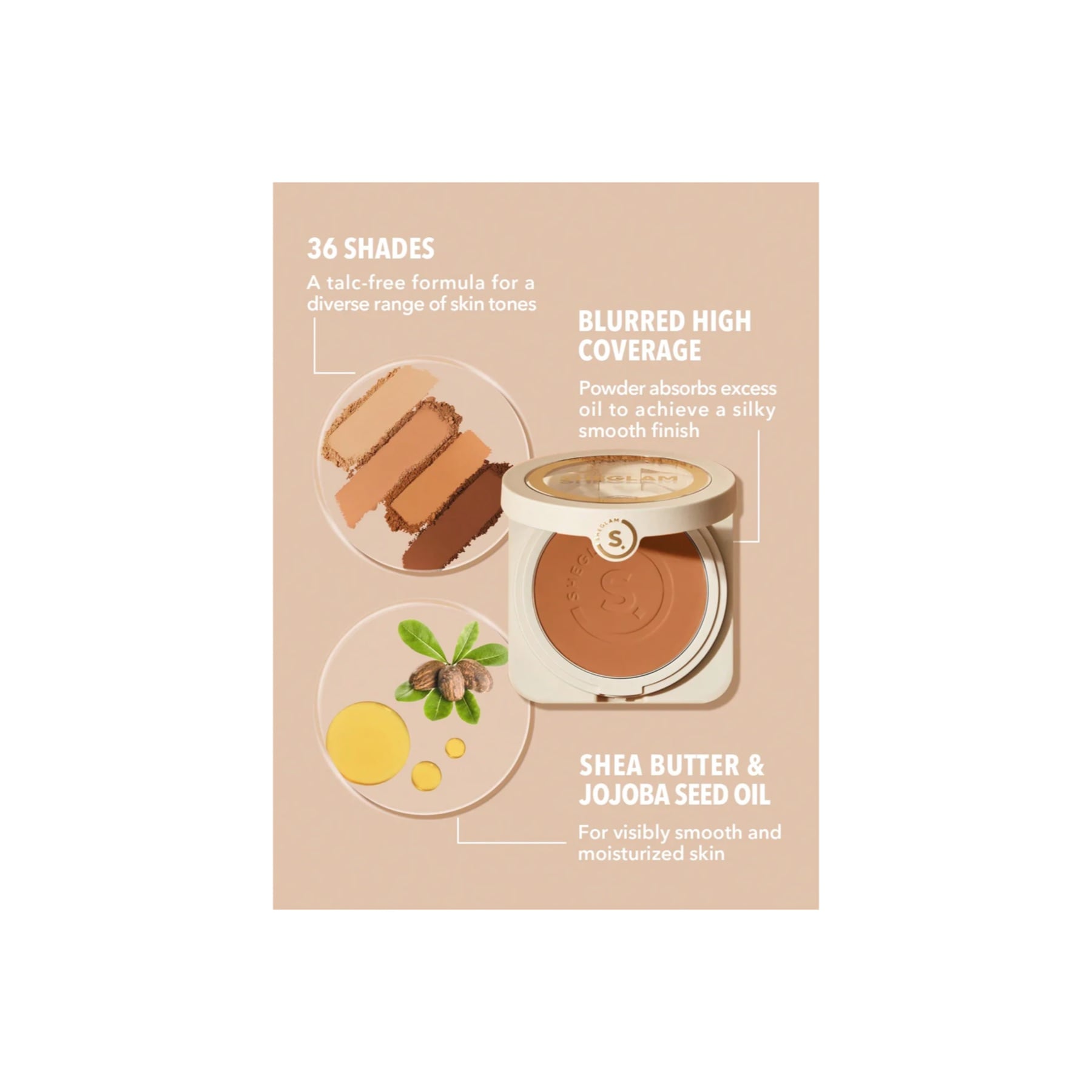 - Say BUH-BYE to unwanted shine and HELLO to a soft, smooth, and lightweight full-coverage finish! Sheglam Skin Focus High Coverage Powder Foundation features a talc-free formulation, enriched with natural shea butter and jojoba seed oil, that removes shine while making your skin appear silky smooth!