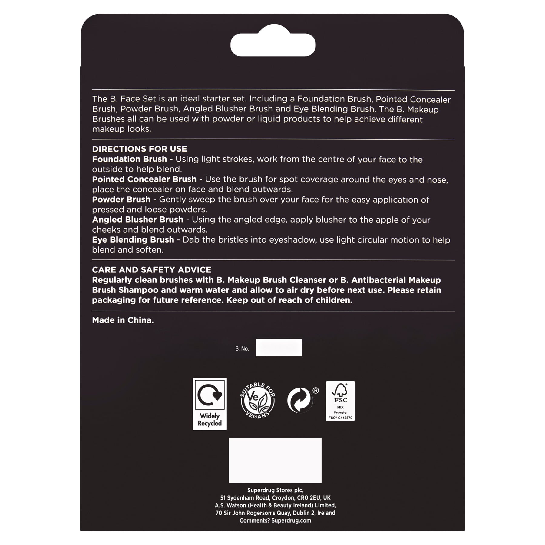 - Superdrug B. 5 Piece Brush Set is an ideal starter face set including foundation, pointed concealer, powder, angled blusher and eye blending brushes that work with liquid or powder products to create professional makeup looks