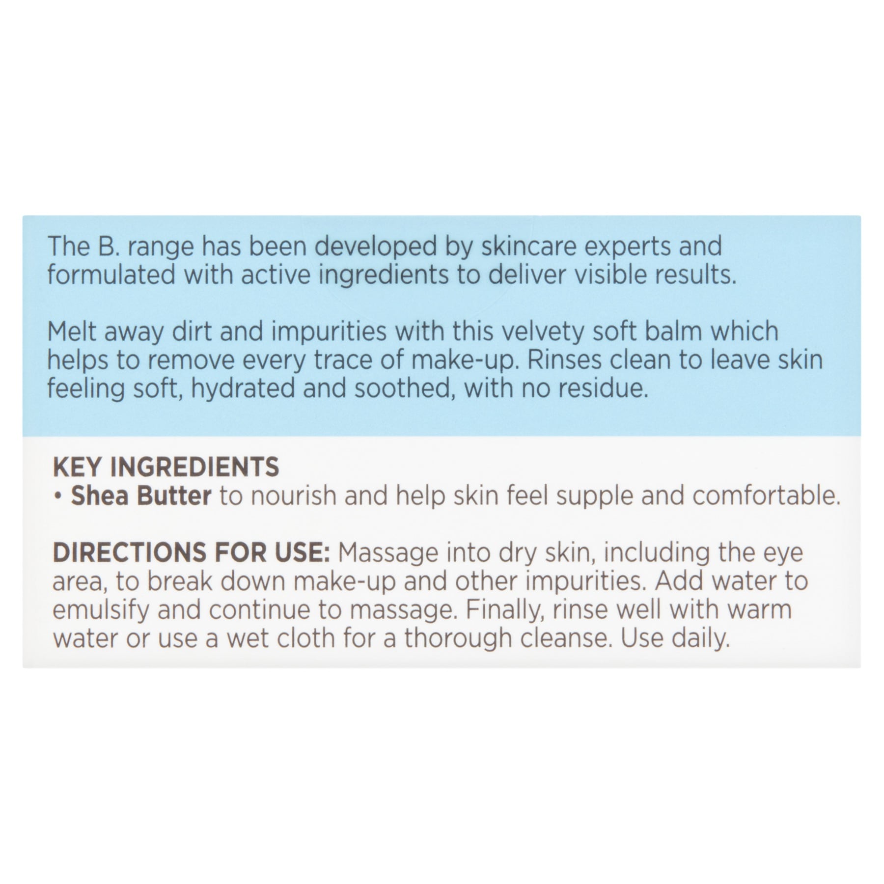 - Superdrug B. Melting Cleansing Balm effortlessly melts away makeup and impurities with a velvety soft texture while shea butter nourishes so skin feels soft, hydrated and soothed with no residue