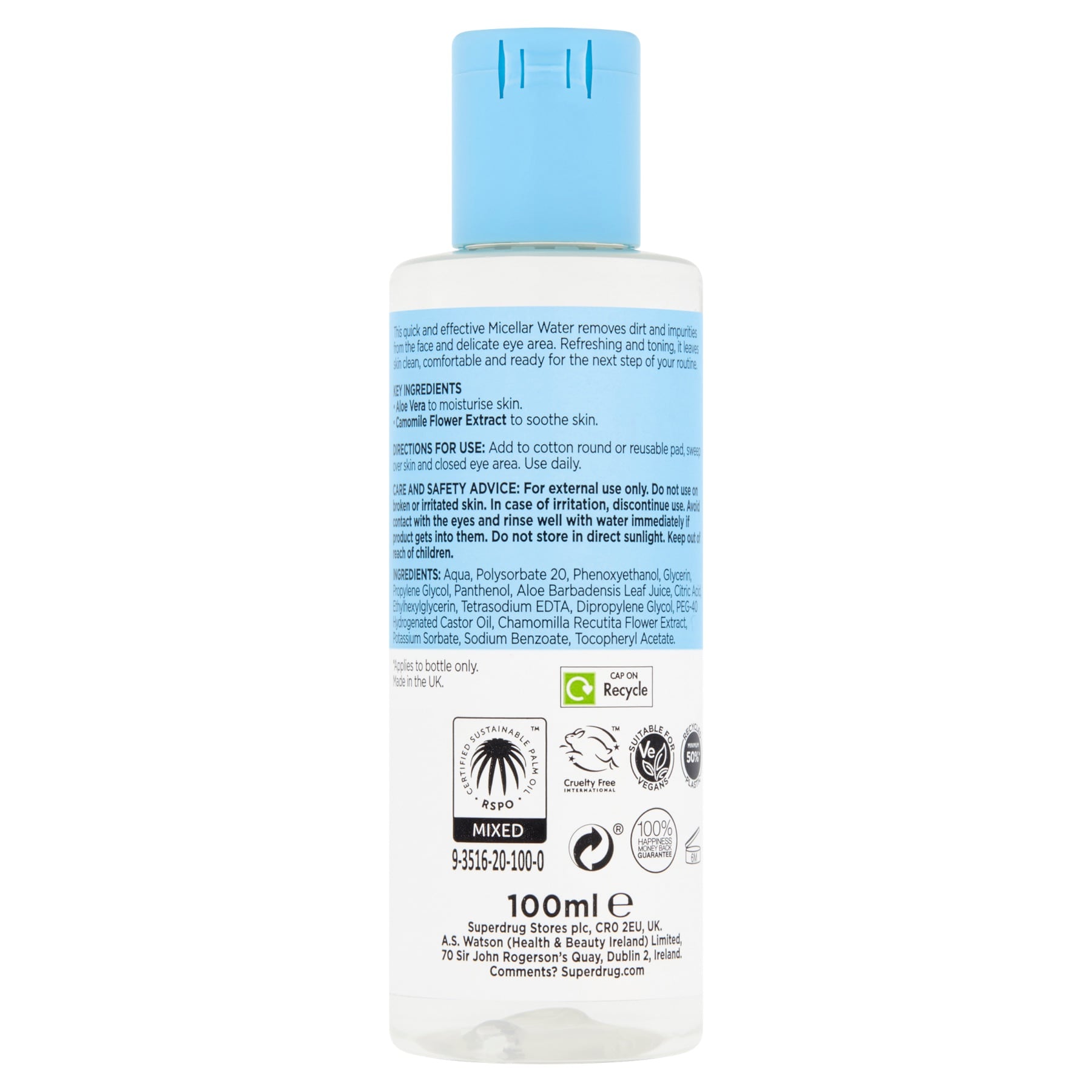 - Superdrug B Micellar Water 100ml is a gentle no rinse cleanser that cleanses, tones and refreshes with aloe vera and chamomile extract to soothe skin, suitable for all skin types including sensitive, vegan and cruelty free with recyclable packaging