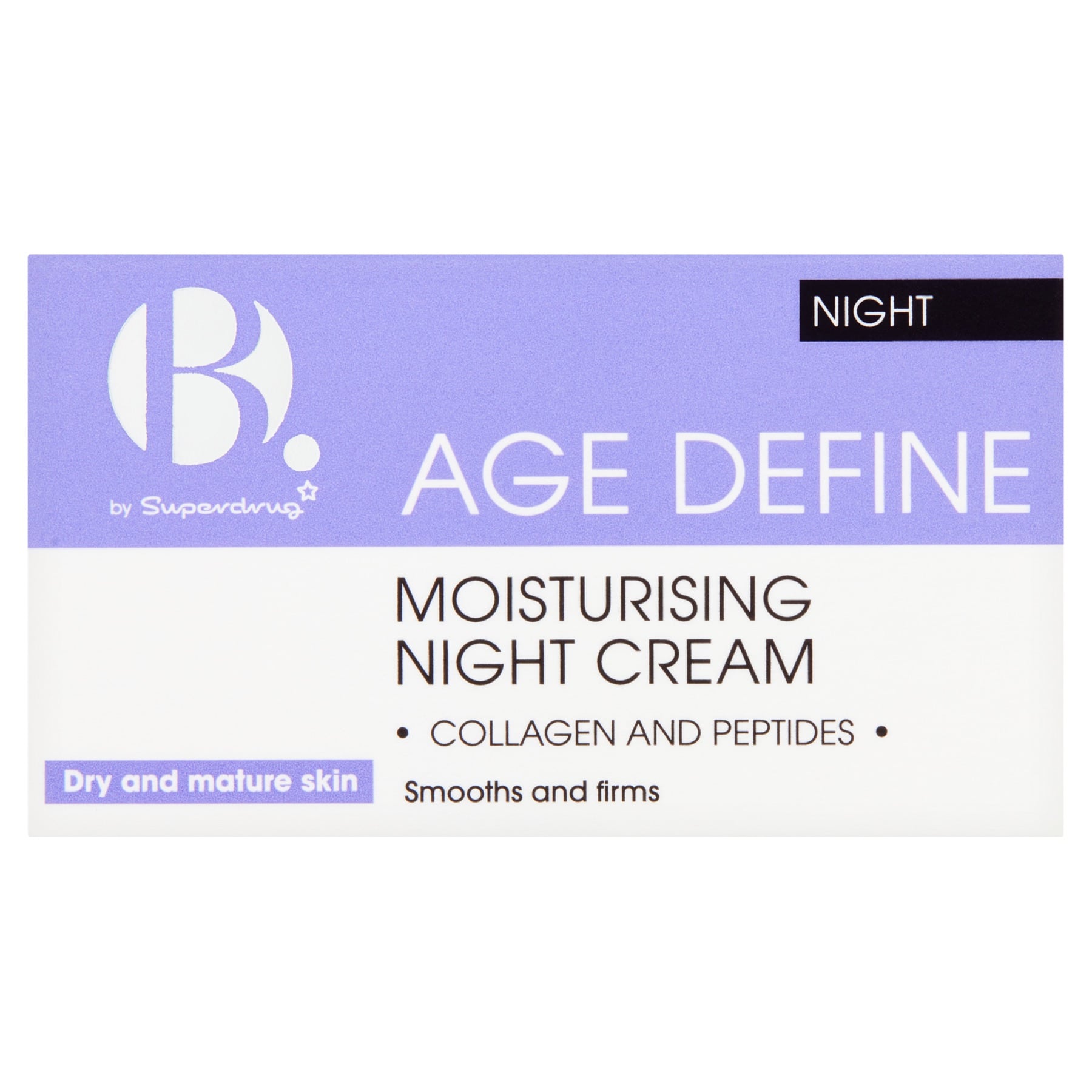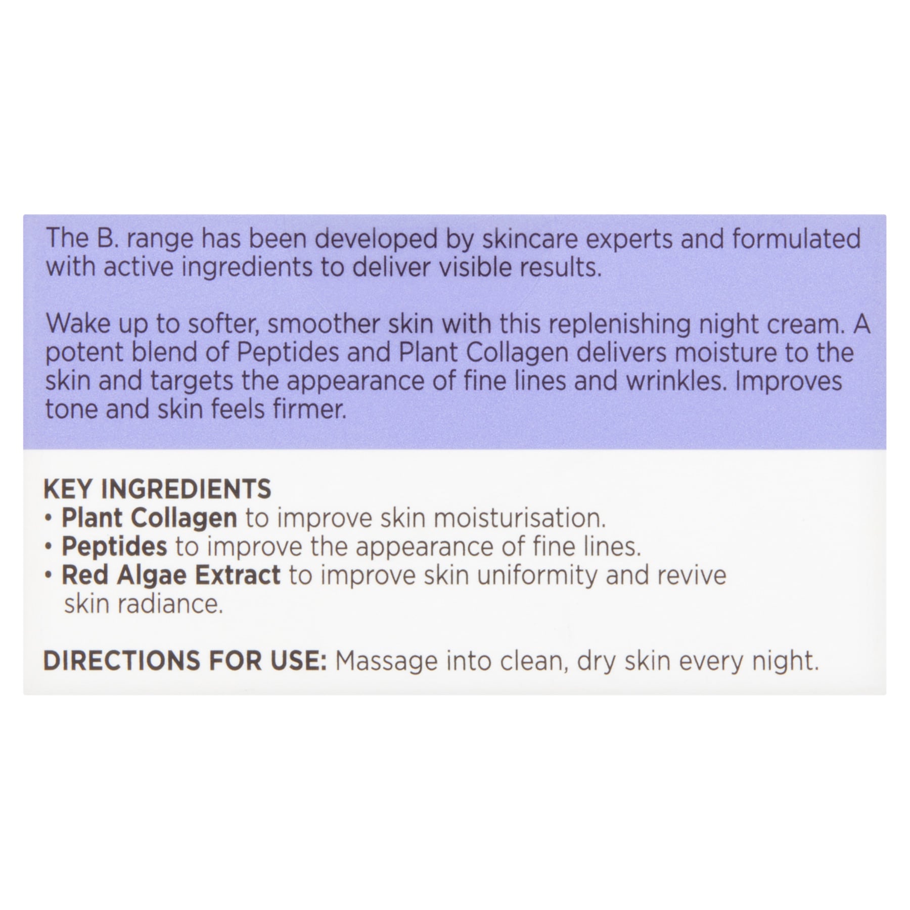 - Superdrug B. Moisturising Night Cream 50ml replenishes skin overnight with peptides and plant collagen to deeply moisturise, improve firmness and tone, and reduce the appearance of fine lines while red algae extract helps revive skin radiance