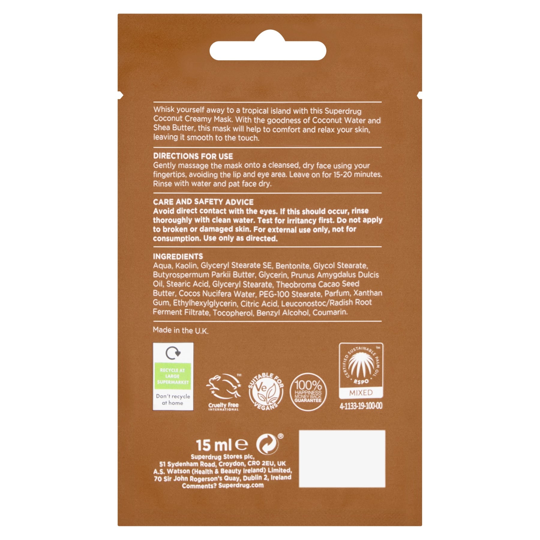 - Superdrug Creamy Coconut Face Mask 15ml pampers skin with coconut water and shea butter to comfort, relax and leave it soothed to the touch