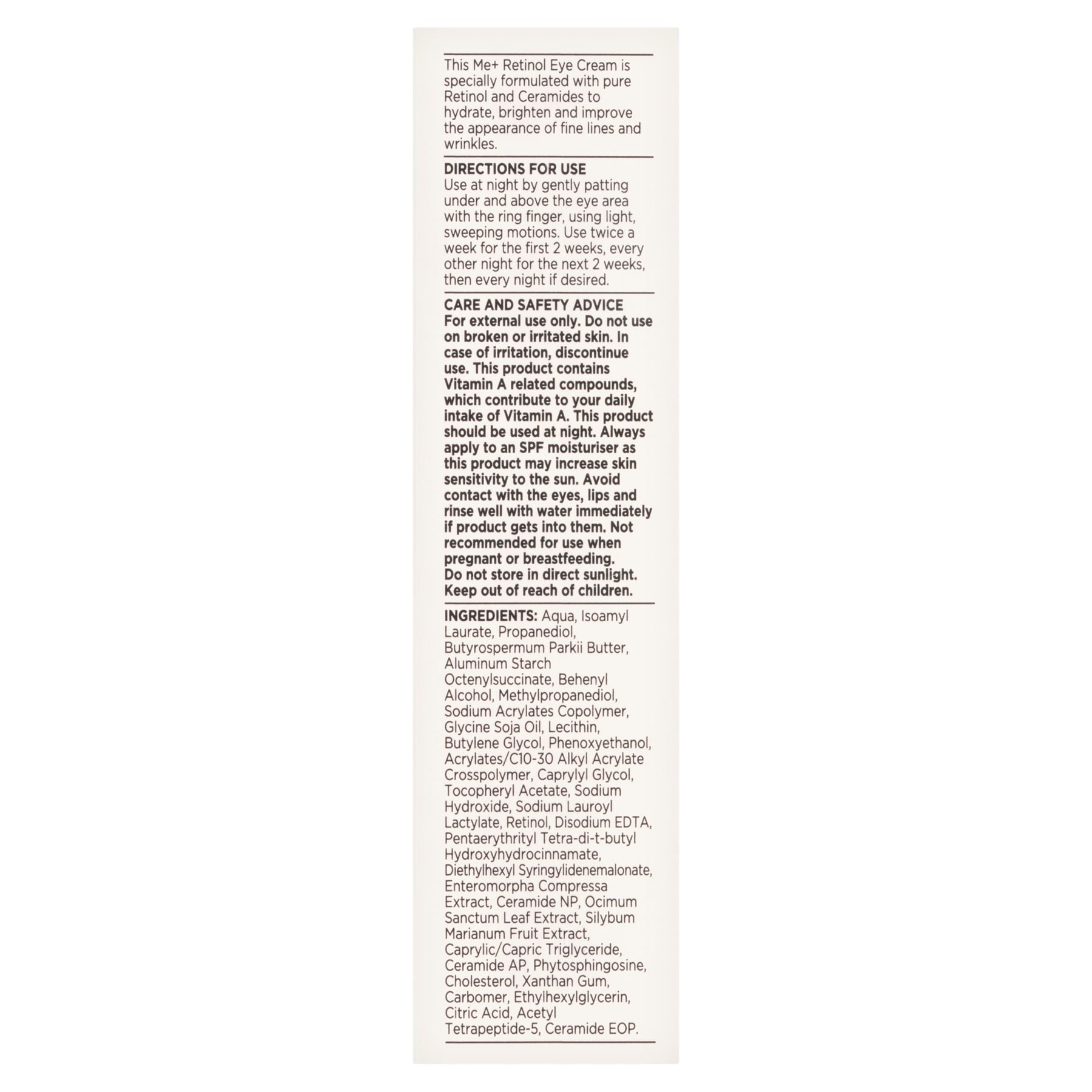 - Superdrug Me Retinol Eye Cream 15ml is formulated with pure retinol, peptides and ceramides to hydrate, brighten and improve the appearance of wrinkles and fine lines around the eyes while targeting visible signs of ageing