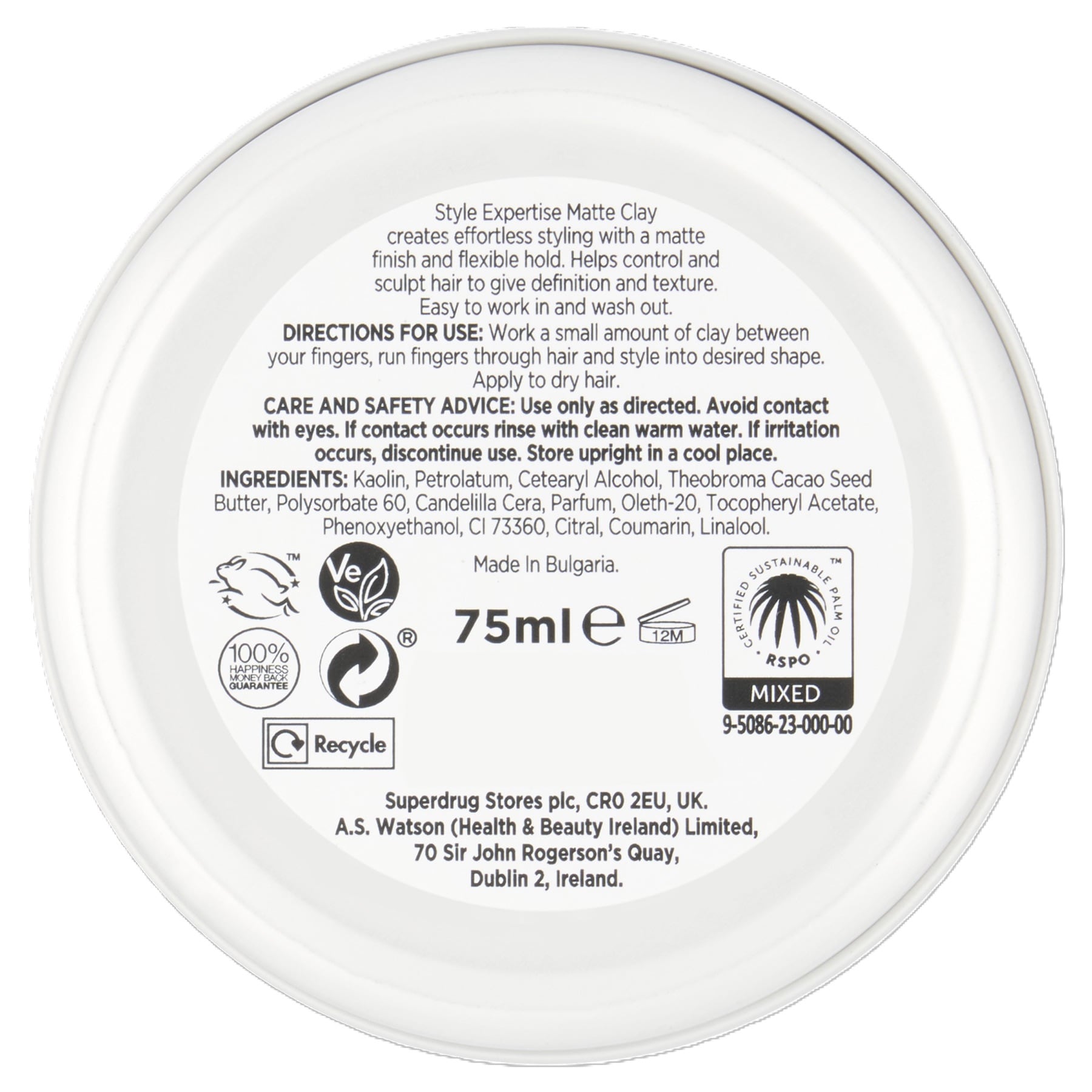 - Style Expertise Matte Clay creates effortless styling with a matte finish and flexible hold. Helps control and sculpt hair to give definition and texture. Easy to work in and wash out. Shape & Hold Matte Finish