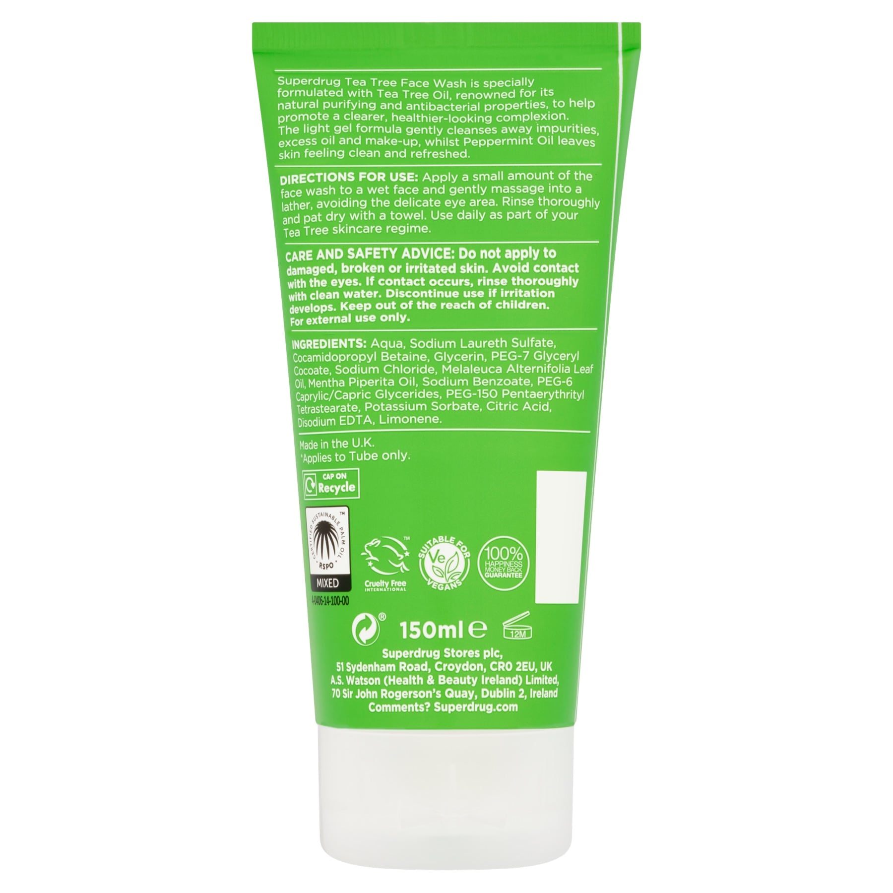 - Superdrug Tea Tree Face Wash 150ml is a gel wash with tea tree oil to promote a clearer complexion while removing impurities, oil and makeup and peppermint oil leaves skin clean and refreshed