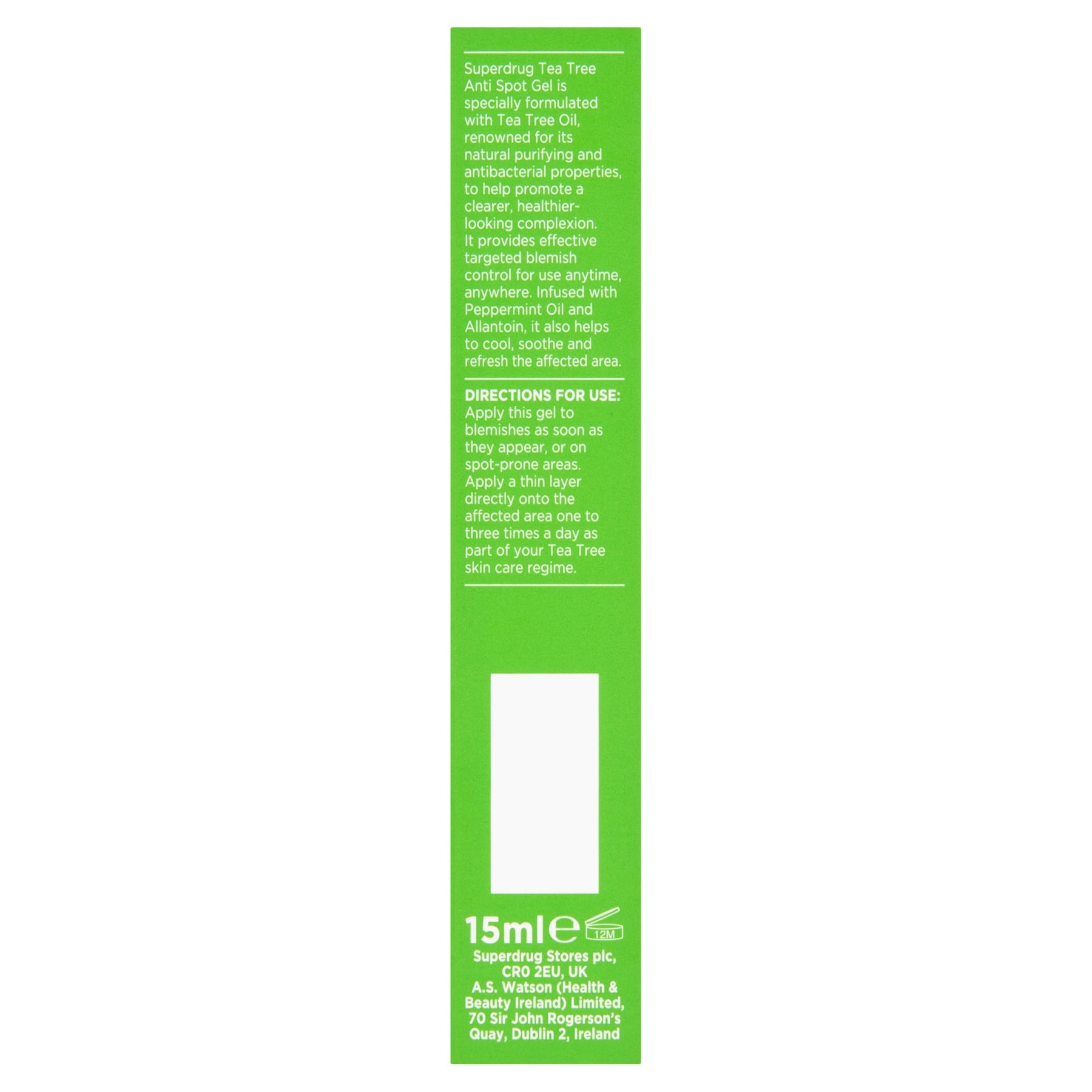 - Superdrug Tea Tree Spot Gel 15ml provides effective blemish control for a clearer, healthier looking complexion with natural tea tree and peppermint oils plus allantoin