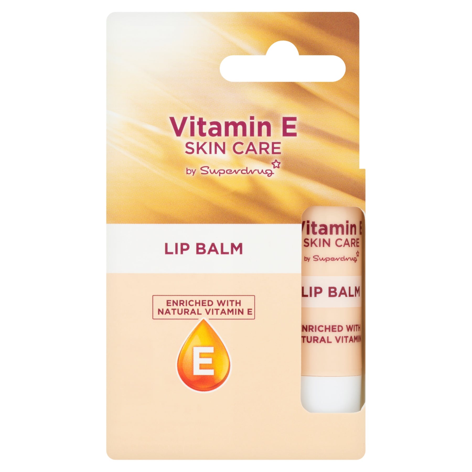 - Superdrug Vitamin E Lip Balm is enriched with naturally sourced vitamin E and shea butter to nourish, soften and protect dry lips from environmental damage while keeping them smooth and cared for