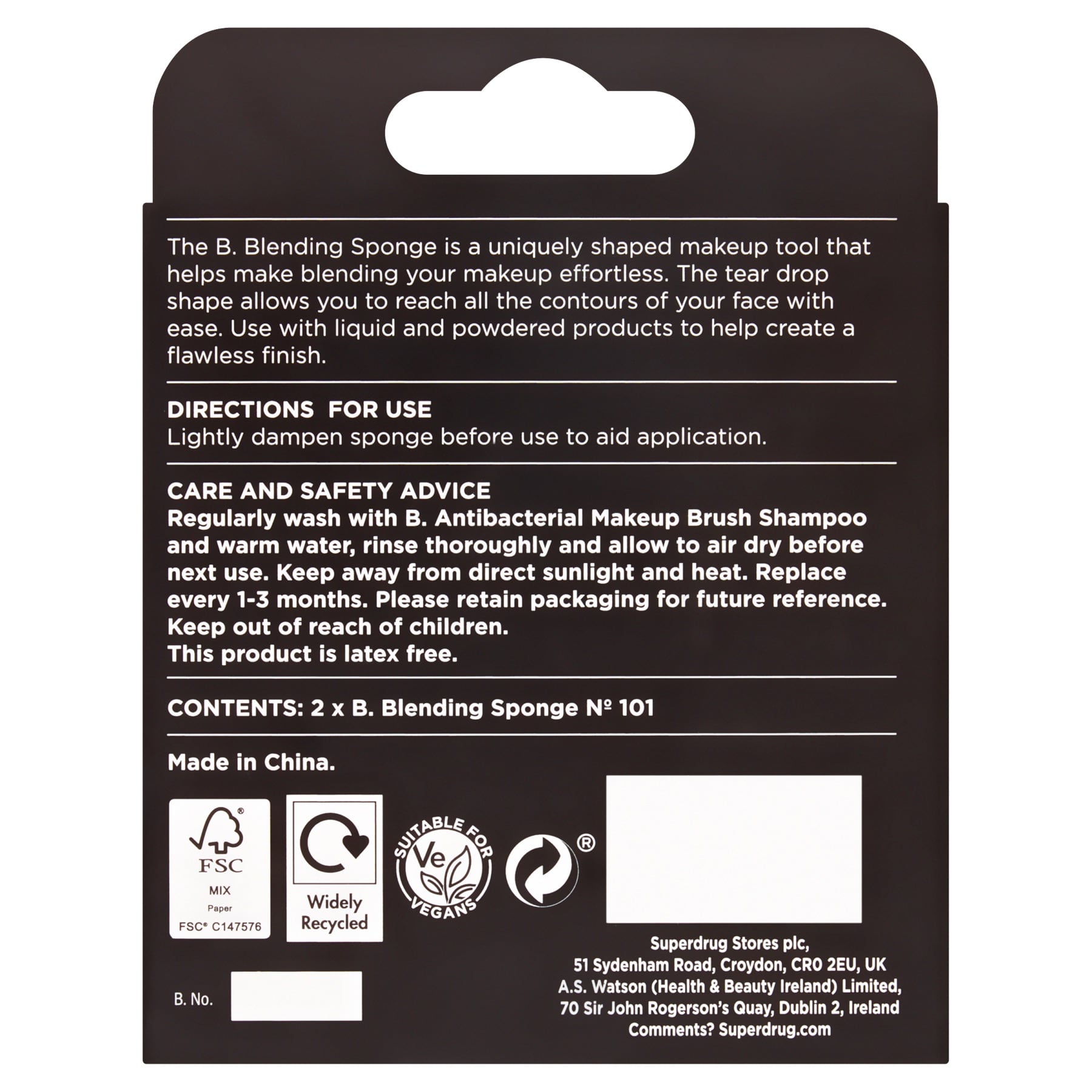 - Superdrug20 B. Blending Sponge 2 Pack offers two uniquely shaped blending sponges whose tear drop design reaches all facial contours to make liquid and powder makeup blending effortless for a flawless finish