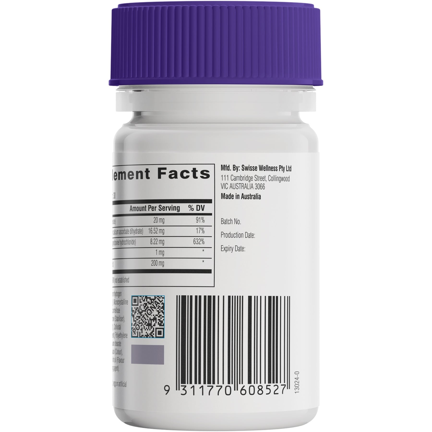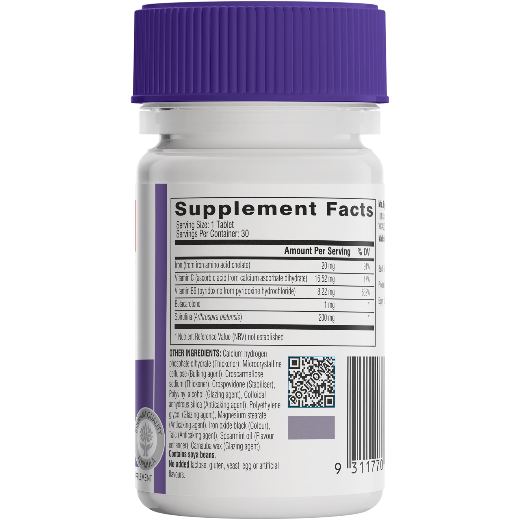 Iron (from iron amino acid chelate) 20 mg Vitamin C (ascorbic acid from calcium ascorbate dihydrate) 16.52 mg Vitamin B6 (pyridoxine from pyridoxine hydrochloride) 8.22 mg Betacarotene 1 mg Spirulina (Arthrospira platensis) 200 mg