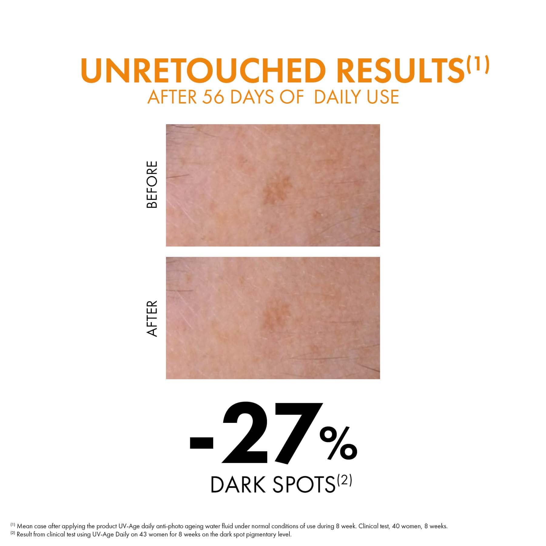 - Ultra-high SPF 50+ UVA PF 46 protection against UV radiation and pollution. Targets existing photo ageing signs including dryness and dull complexion Helps correct and protect against wrinkles and dark spots Strengthens skin barrier function Suitable for all skin types and tones, with invisible skin finish Dermatologist tested. Hypoallergenic. Non-comedogenic. Anti eye-stinging, tested under ophthalmological control. Clinical test on dark-spots pigmentation with image analysis on 43 women, during 56 days on daily use.