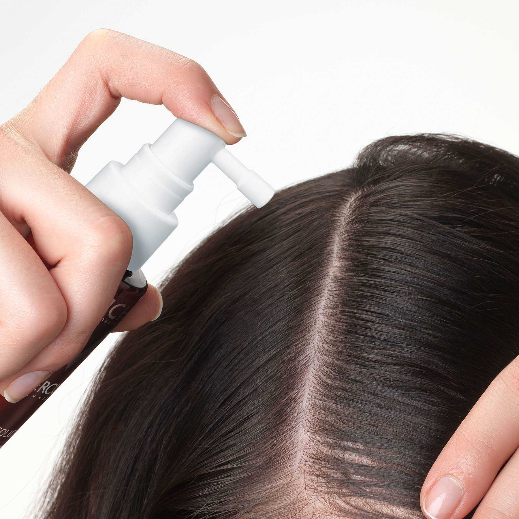 - Spray section by section at the roots, applying 5 pumps of the product on each section. Then use your fingertips to massage into your scalp to ensure that the product is absorbed. Do not rinse.