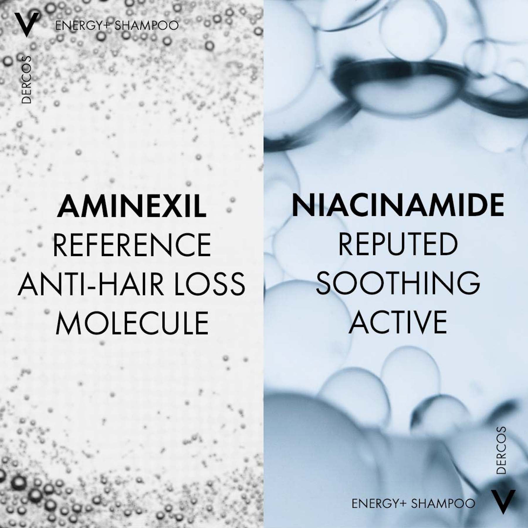 - Vichy Dercos Energy + Stimulating Shampoo is enriched with Vichy's patented molecule Aminexil,Niacinamide, AHA and VitaminE. Energy + Shampoo is designed to reduce the rate of hair loss, increase volume from the first application . Developed as a complement to hair-loss treatments, this shampoo is the only shampoo containing Aminexil. Hair is left feeling nourished, revitalized, and reinforced from root to tip, with an energized feel. Hair becomes stronger and more vigorous from roots to tips after 3 weeks. Clinically reduces hair loss after 6 weeks. Suitable for all hair types
