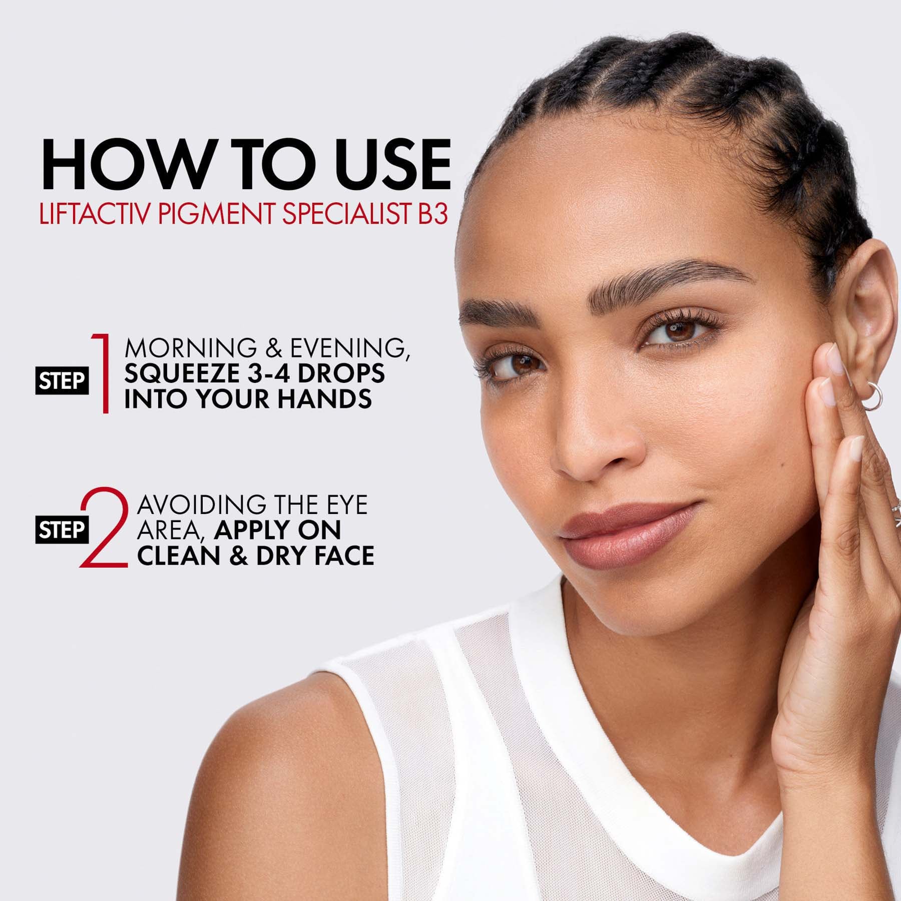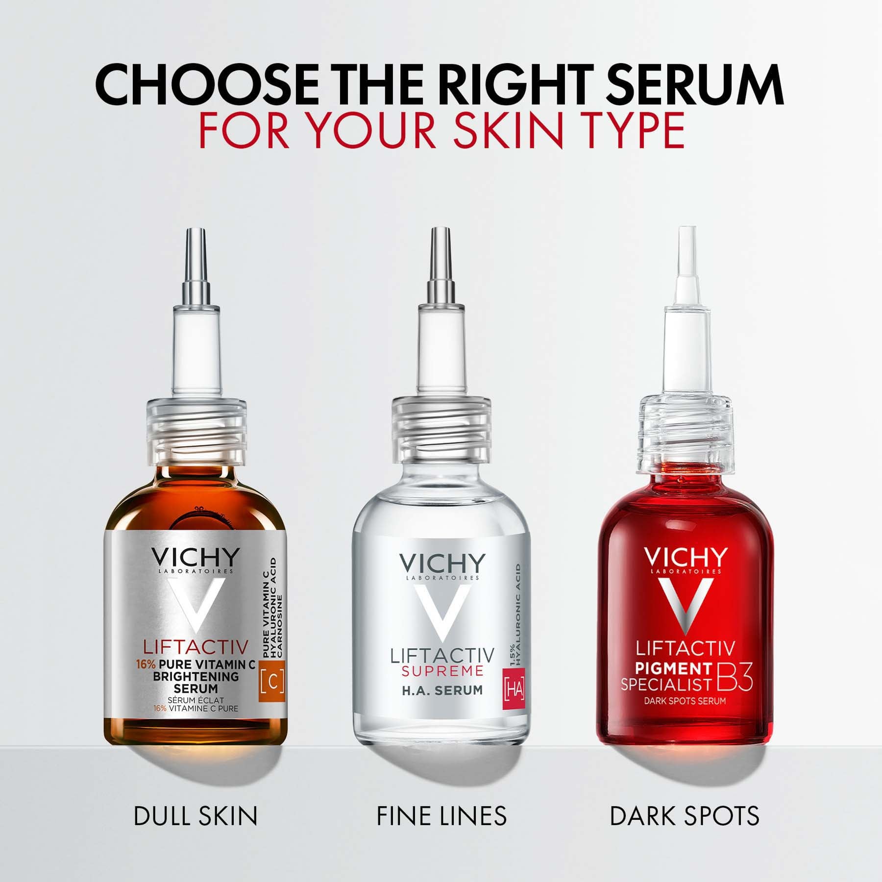 - Vichy LiftActiv Specialist B3 Dark spot serum has a hypoallergenic formula that visibly corrects dark spots, and reduces the appearance of discoloration marks and wrinkles. It revives radiance and unifies the complexion. Infused with 4% niacinamide, glycolic acid, and vitamin CG, the high-performance formula helps to refine and even the skin tone. Suitable for all skin types, the carefully formulated serum is lightweight in texture, seeking to brighten and uplift the skin.This formula is suitable for all skin tones, and is fragrance free & allergy tested.Clinically tested by dermatologists to be suitable for all skin types