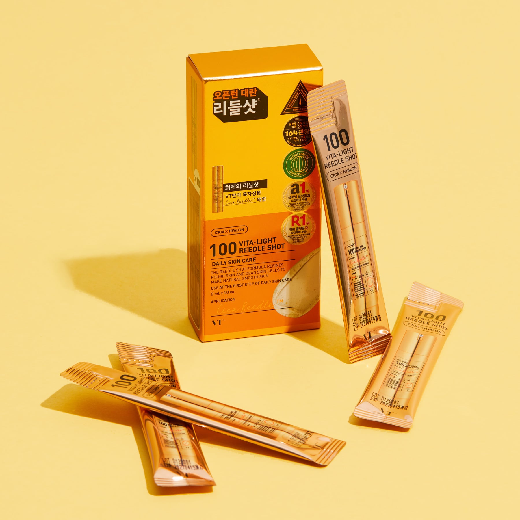 - VT 100 Vita Reedle Shot Stick Pouch (10Ea) with Vitamin C helps refine and brighten rough skin, achieving smooth and dewy skin. It is conveniently packaged for single-use application.