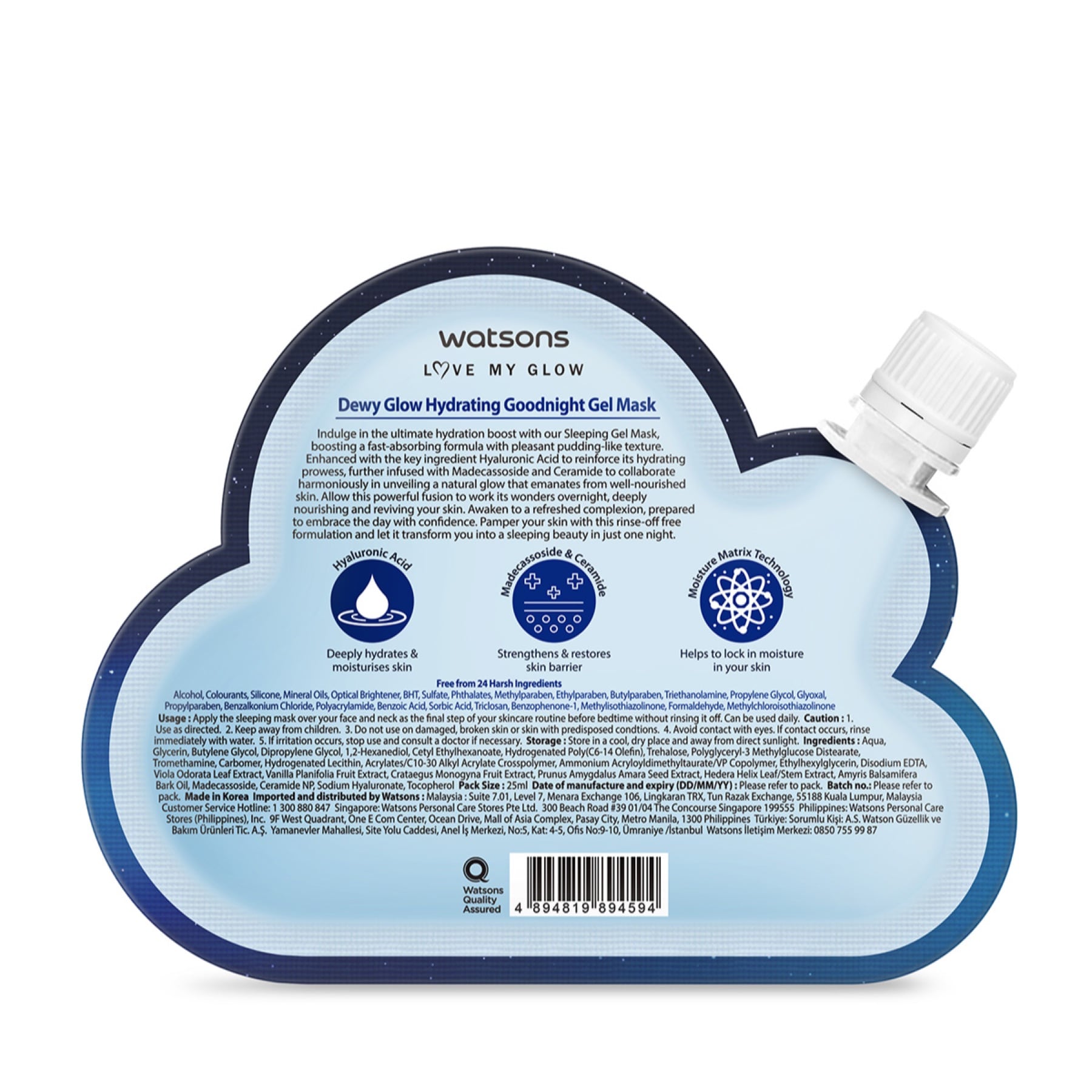 - Indulge in the ultimate hydration boost with Watsons Dewy Glow Hydrating Goodnight Gel Mask 25ml , boosting a fast-absorbing formula with pleasant pudding-like texture. Enhanced with the key ingredient Hyaluronic Acid to reinforce its hydrating prowess, further infused with Madecassoside and Ceramide to collaborate harmoniously in unveiling a natural glow that emanates from well-nourished skin. Allow this powerful fusion to work its wonders overnight, deeply nourishing and reviving your skin. Awaken to a refreshed complexion, prepared to embrace the day with confidence. Pamper your skin with this rinse-off free formulation and let it transform you into a sleeping beauty in just one night.
