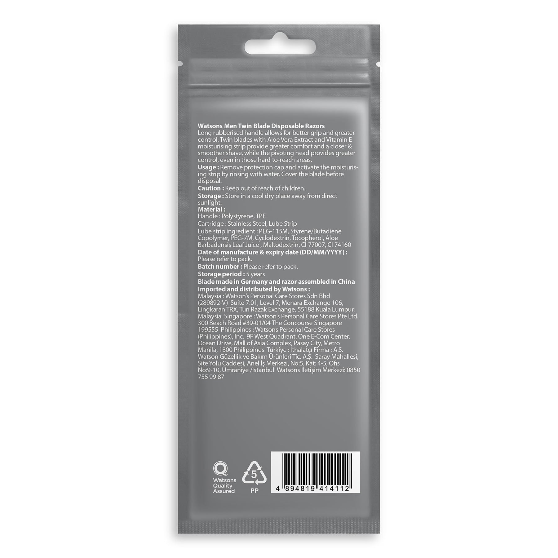 Handle : Polystyrene,Tpe Cartridge : Stainless Steel, Lube Strip Lube Strip Ingredient : Peg-115M, Styrene/Butadiene Copolymer, Peg-7M, Cyclodextrin, Tocopherol, Aloe Barbadensis Leaf Juice , Ma Ltodextrin, Ci 77007, Ci 74160