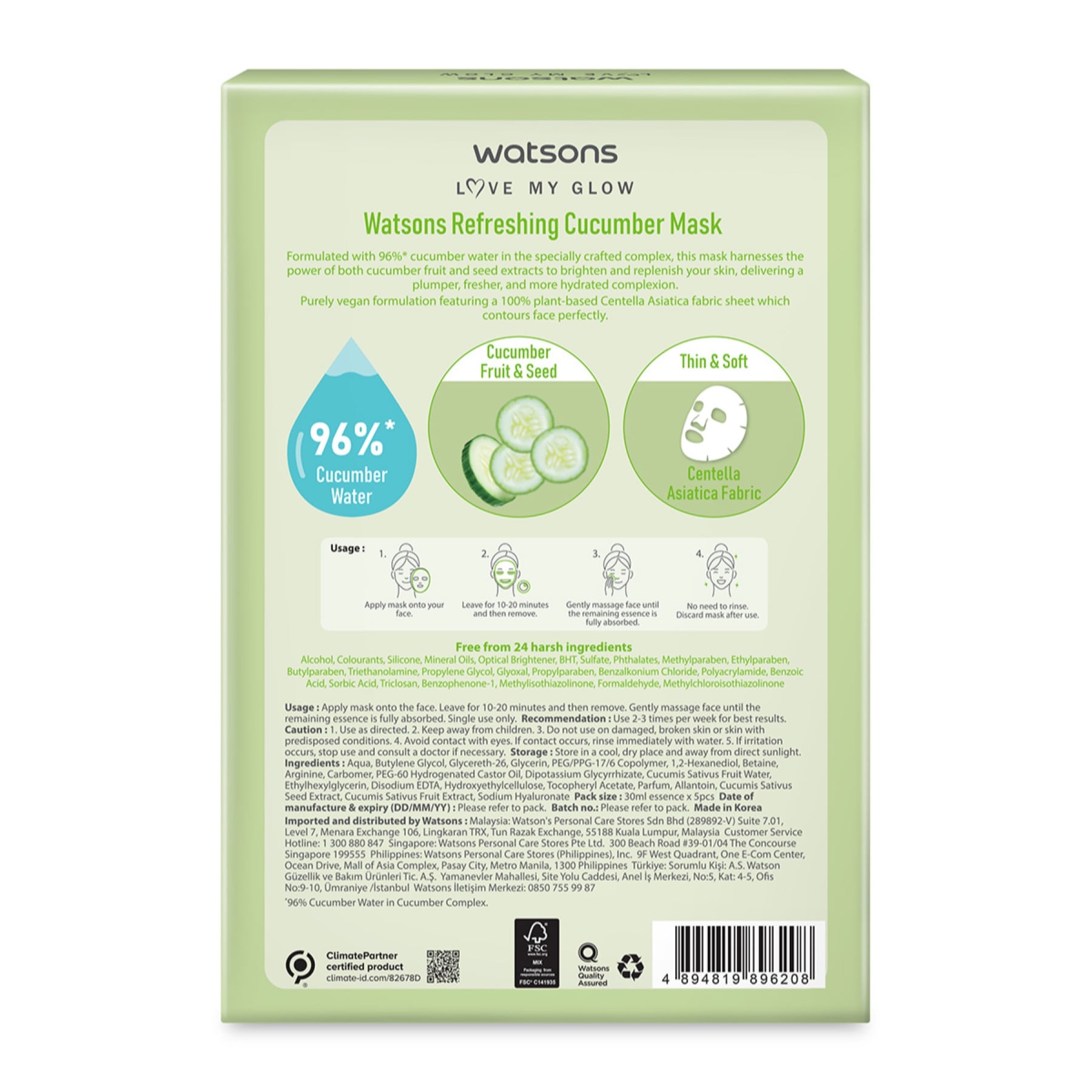 - Formulated with 96% cucumber water in the specially crafted complex, the Watsons Refreshing Cucumber Mask 5pcs harnesses the power of both cucumber fruit and seed extracts to brighten and replenish your skin, delivering a plumper, fresher, and more hydrated complexion. Purely vegan formulation featuring a 100% plant-based centella asiatica fabric sheet which contours face perfectly.