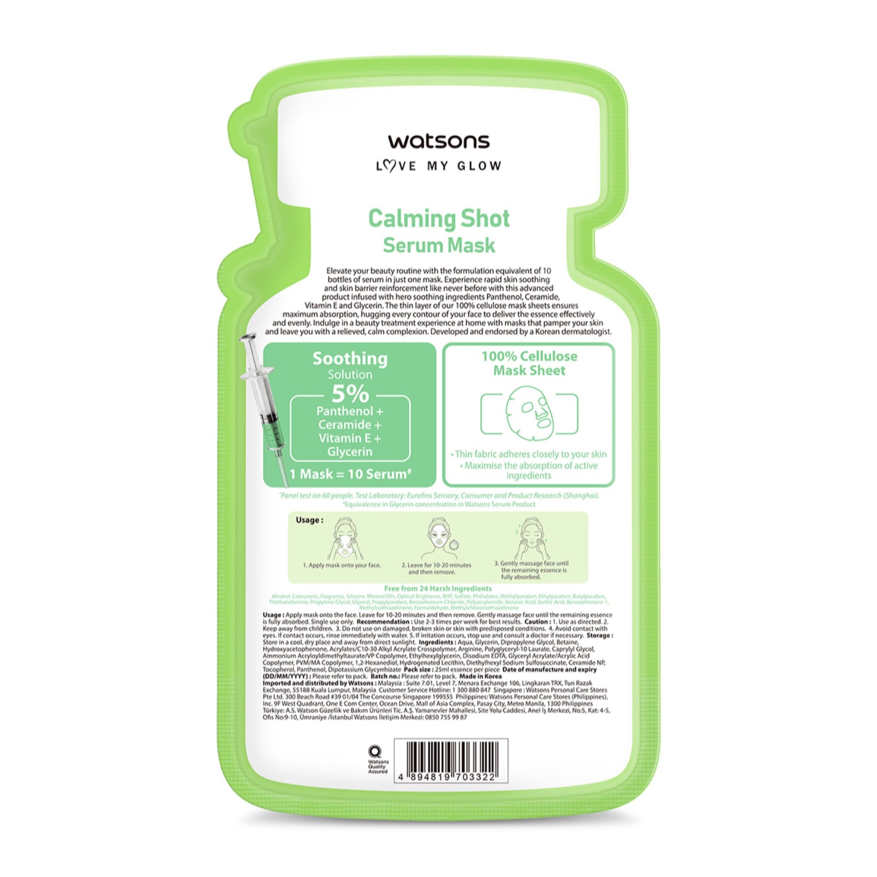 - Apply mask onto the face. Leave for 10-20 minutes and then remove. Gently massage face until the remaining essence is fully absorbed. Single use only.